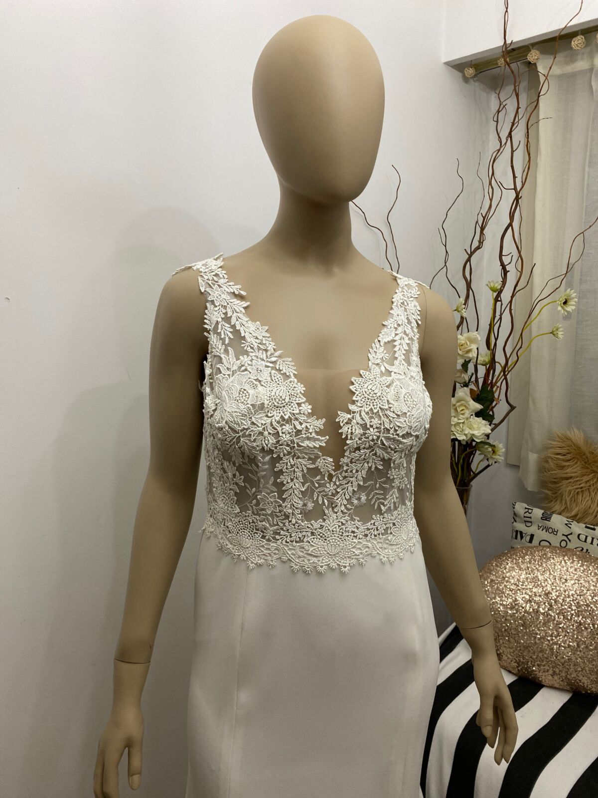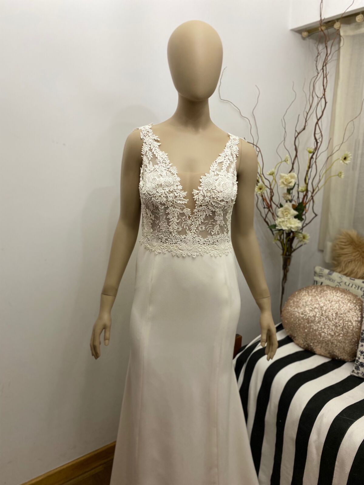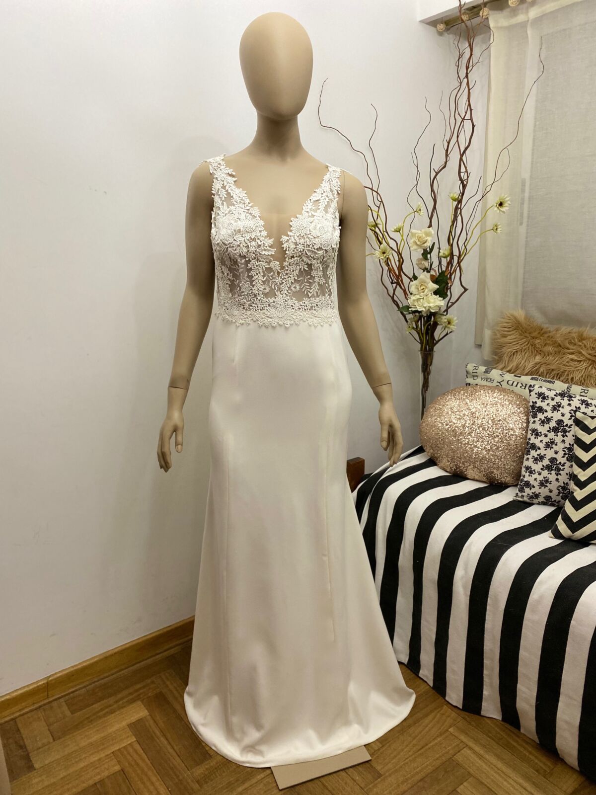 Vestido entero con corsage de tul bordado y guipure con flores 3D con escote delantero en “V” profundo y espalda descubierta, emballenado e incrustado a mano con transparencia. Falda de crêpe opaco con corte tipo sirena. Detalle de faja de guipure calado en la cintura.