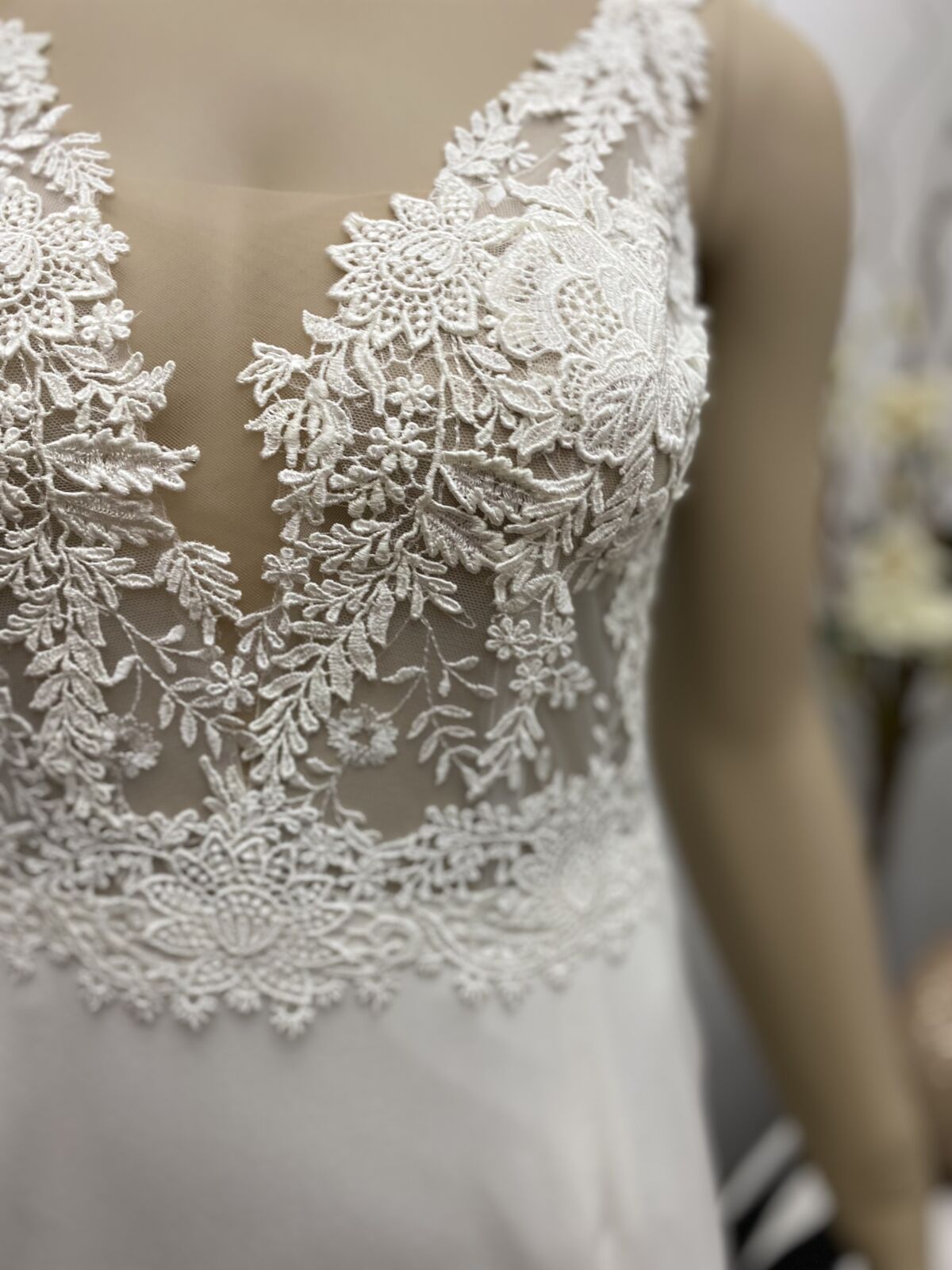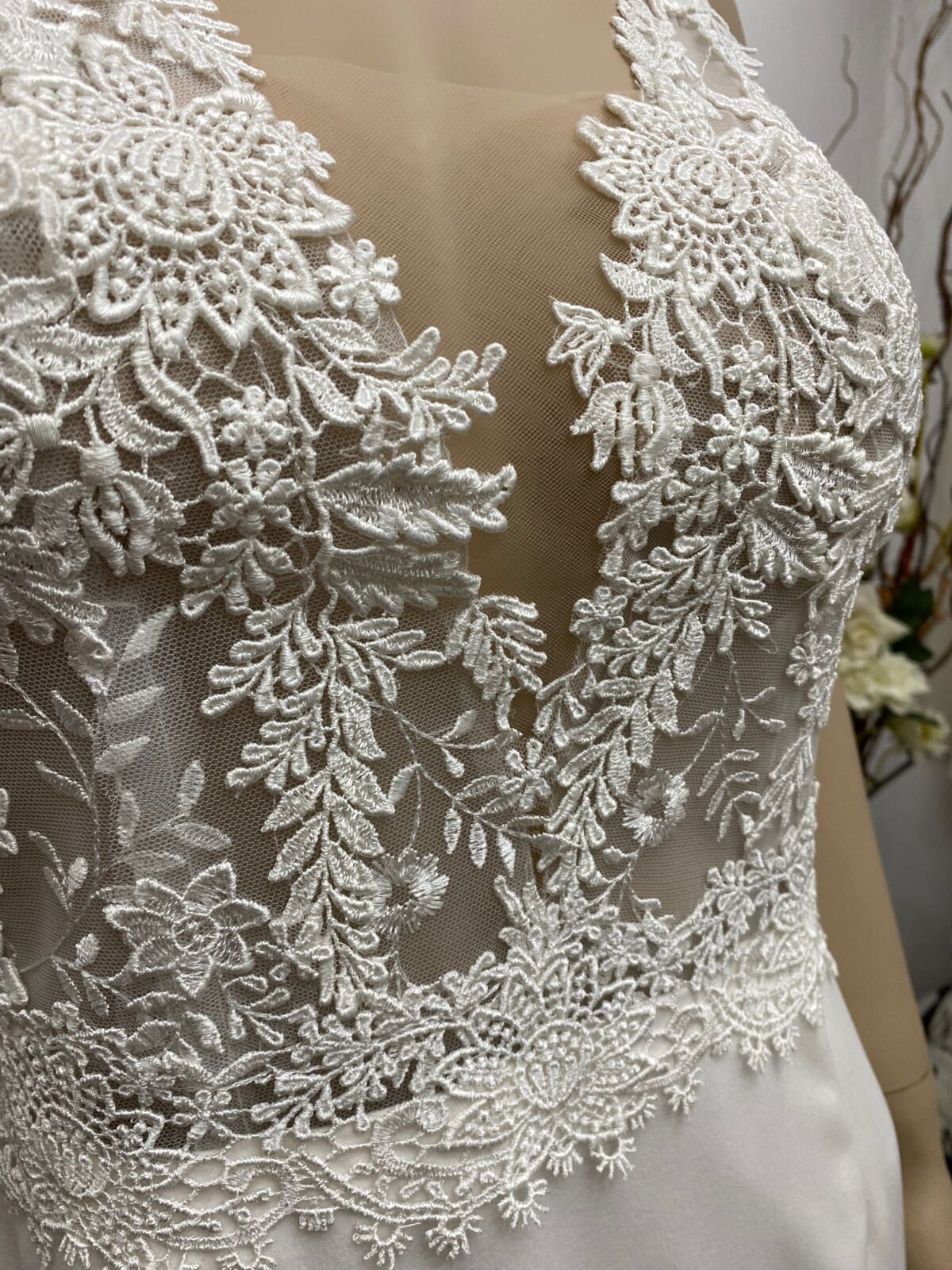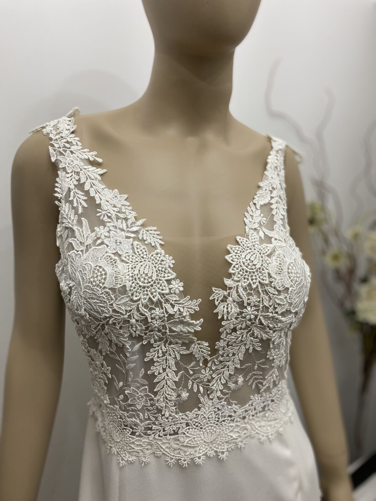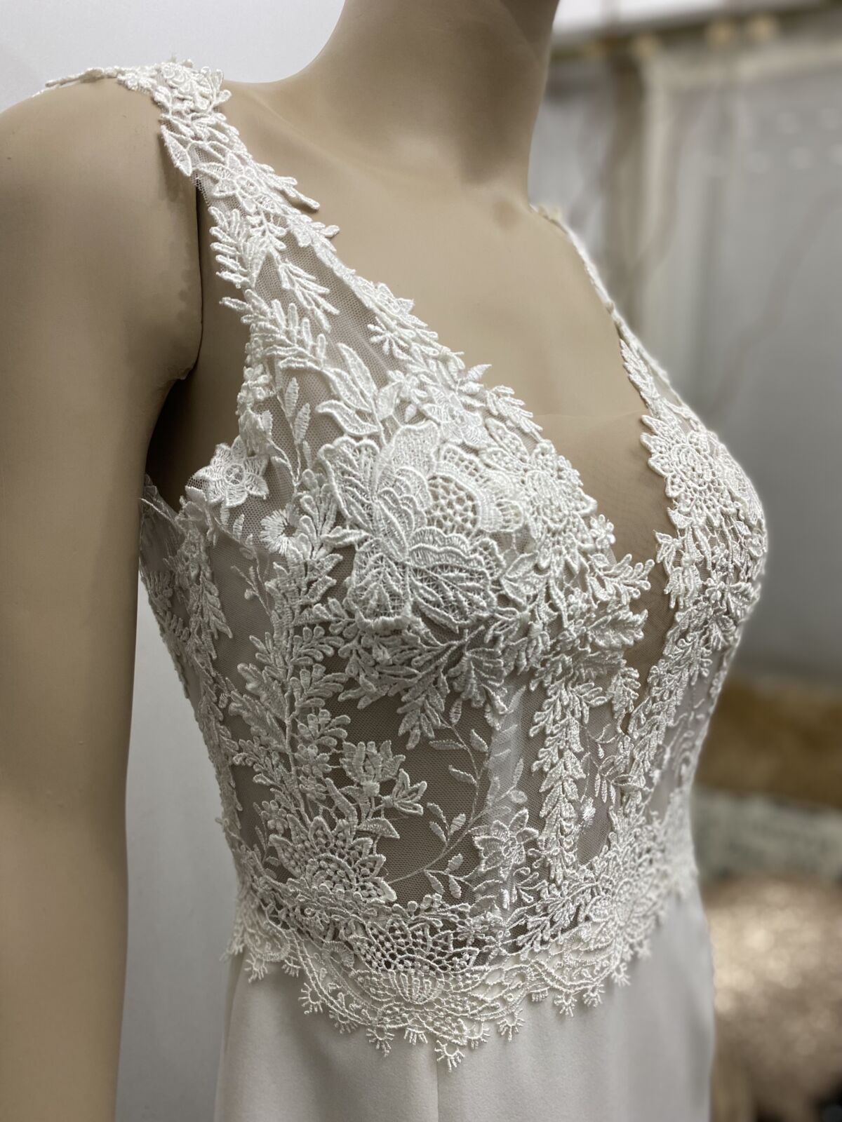 Vestido entero con corsage de tul bordado y guipure con flores 3D con escote delantero en “V” profundo y espalda descubierta, emballenado e incrustado a mano con transparencia. Falda de crêpe opaco con corte tipo sirena. Detalle de faja de guipure calado en la cintura.
