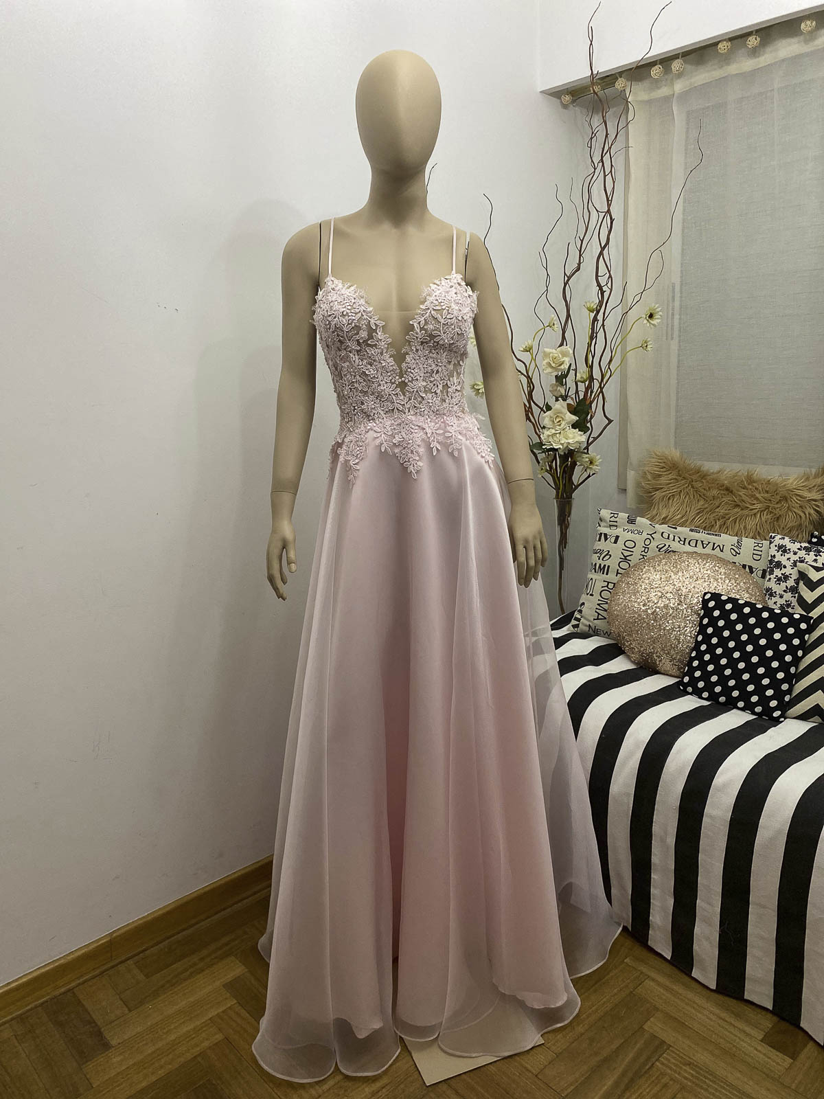 Vestido entero con corsage de encaje rebrodée bordado con piedras y paillettesincrustado a mano. Falda de organza plato con detalle de guías de encaje de guipure.