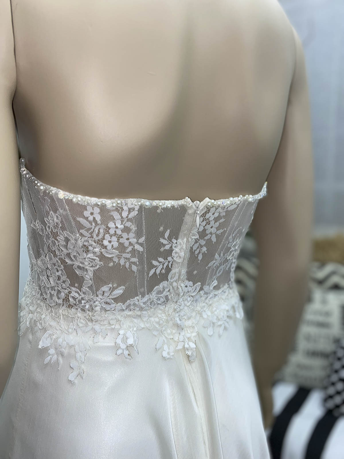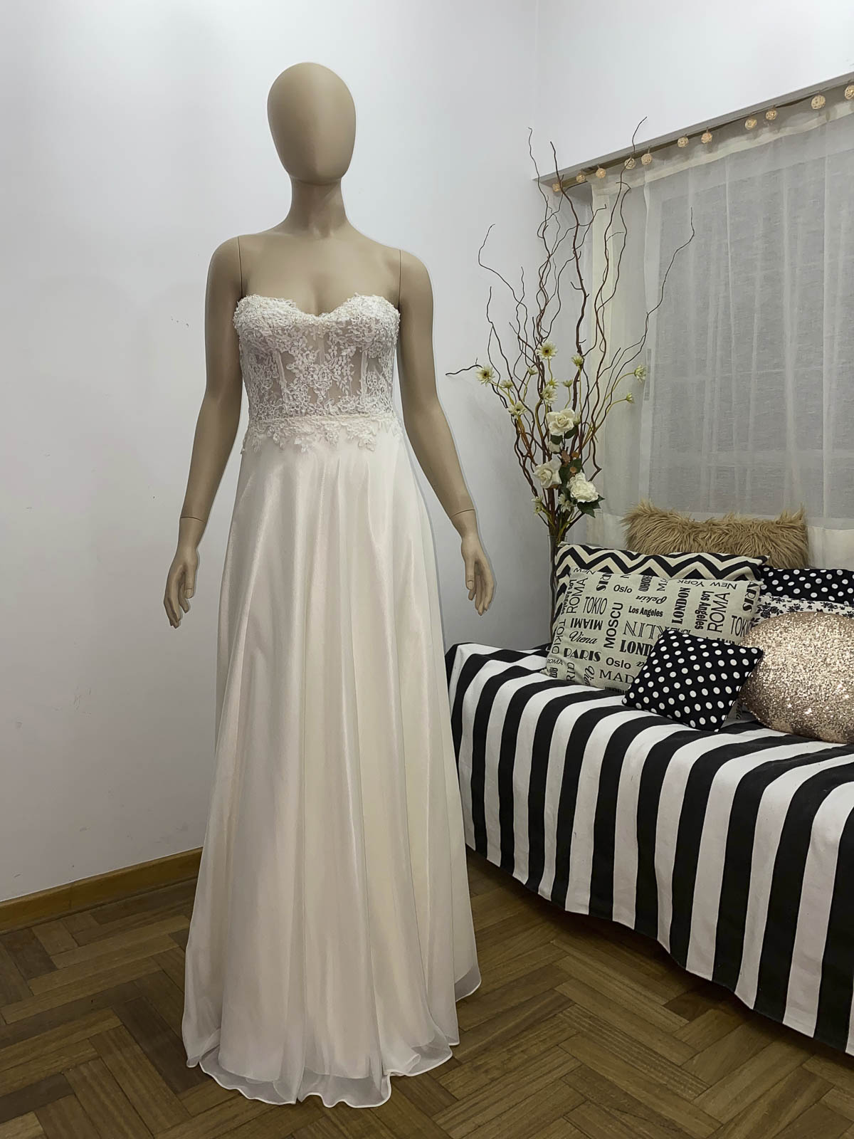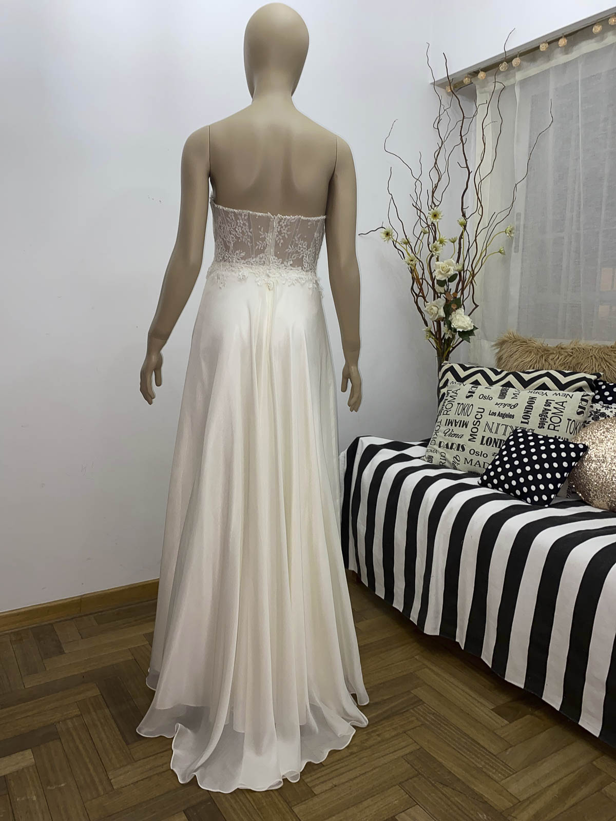 Vestido entero con falda ½ campana de gasa al bies con pequeño arrastre. Corsagestrapless de encaje rebrodée totalmente incrustado a mano y caída de flores de encaje en la cintura. Espalda semi descubierta.
