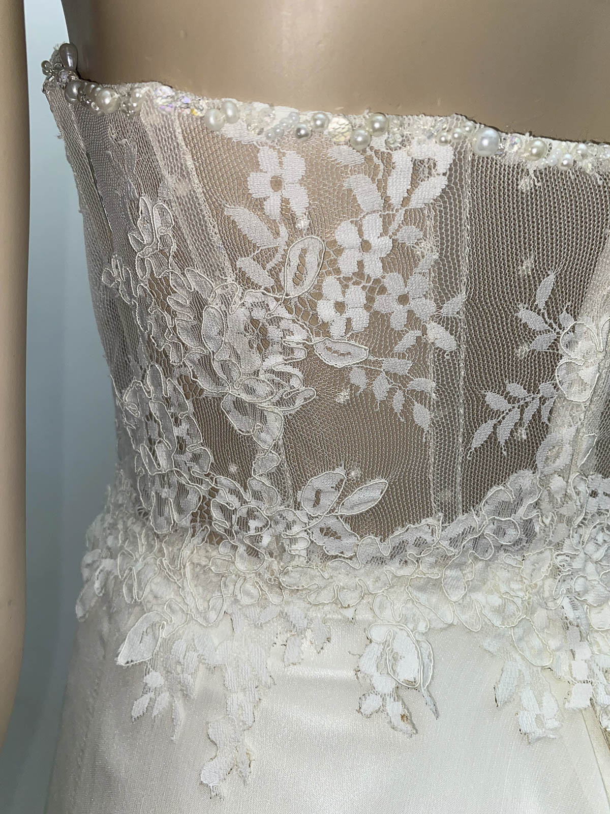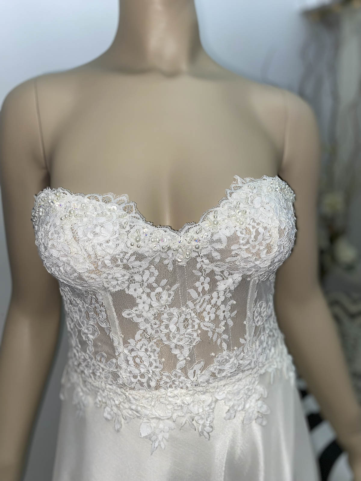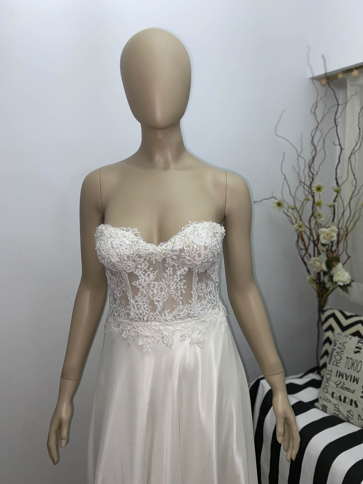Vestido entero con falda ½ campana de gasa al bies con pequeño arrastre. Corsagestrapless de encaje rebrodée totalmente incrustado a mano y caída de flores de encaje en la cintura. Espalda semi descubierta.