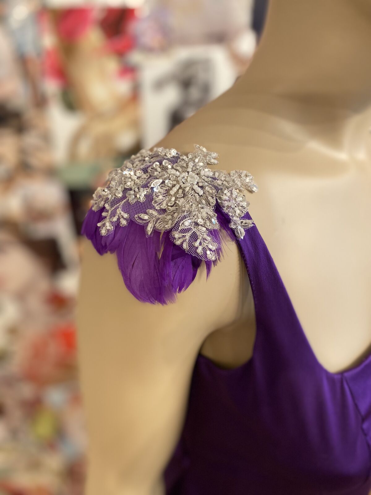 Las charreteras son de tul bordado en tono plata con brillo y plumitas violetas.