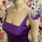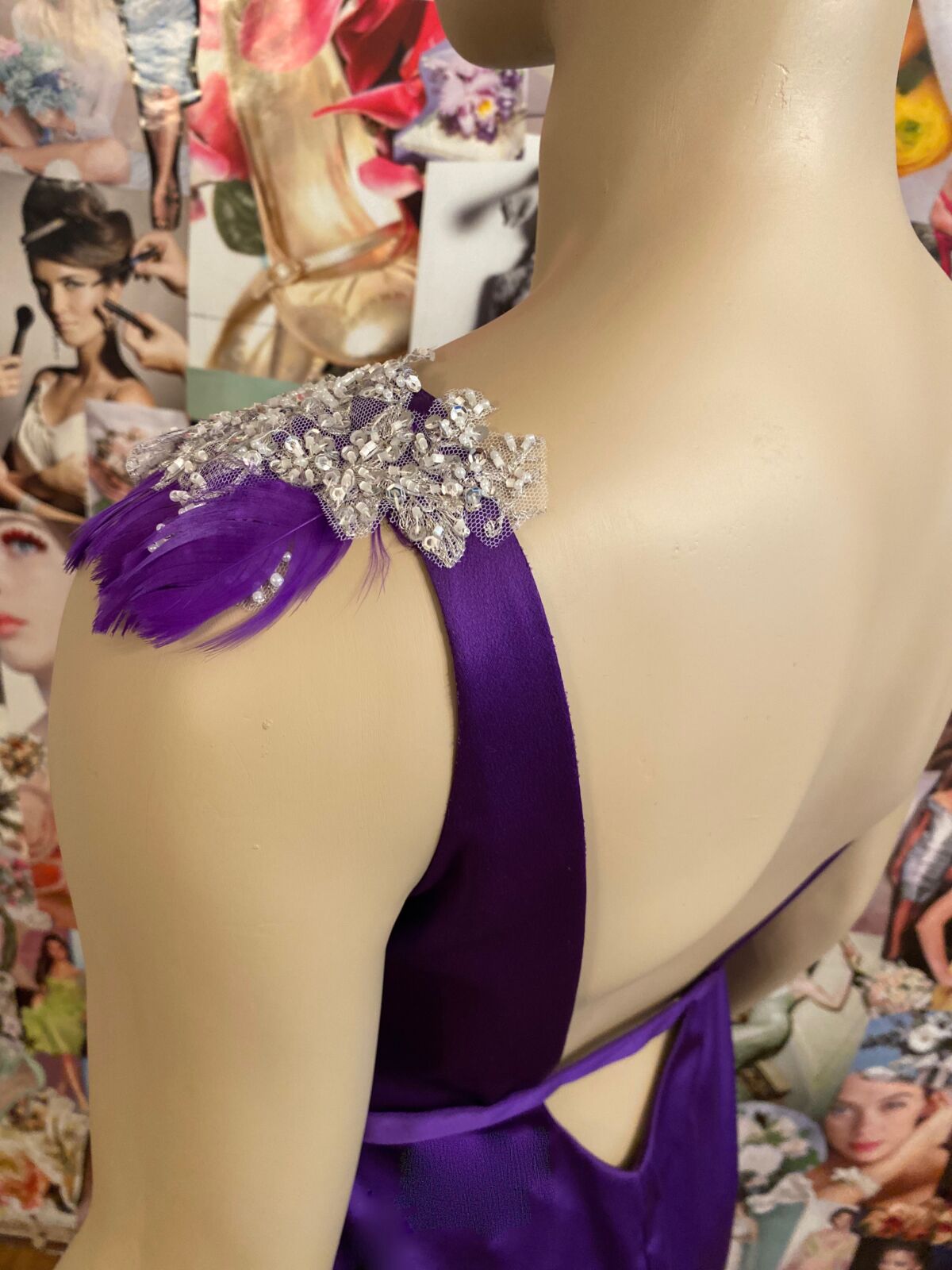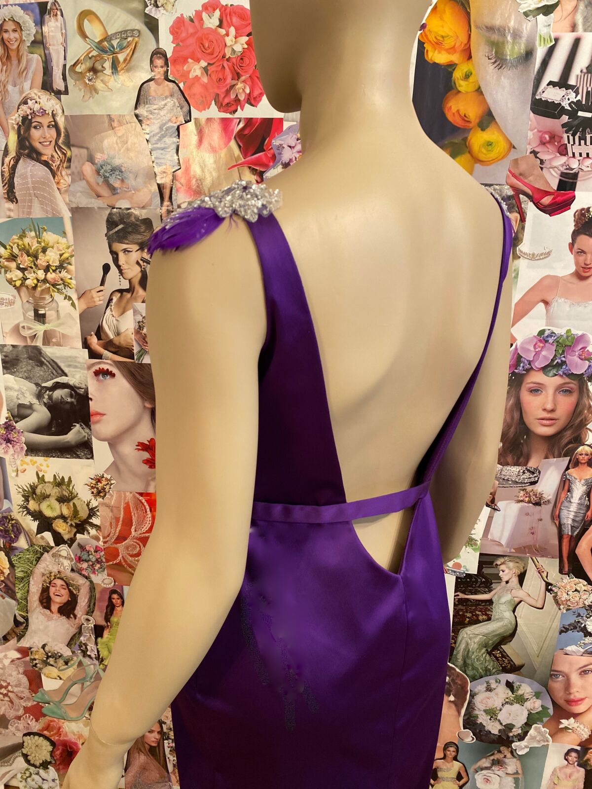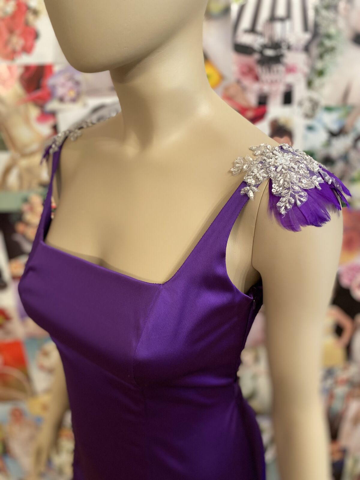 Vestido de raso elastizado color violeta . El delantero tiene un escote cuadrado y la espalda es muy profunda. Corte entubado con tajo en la espalda. Charreteras con brillos y plumas.