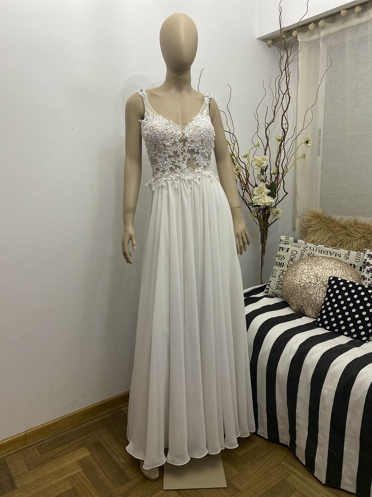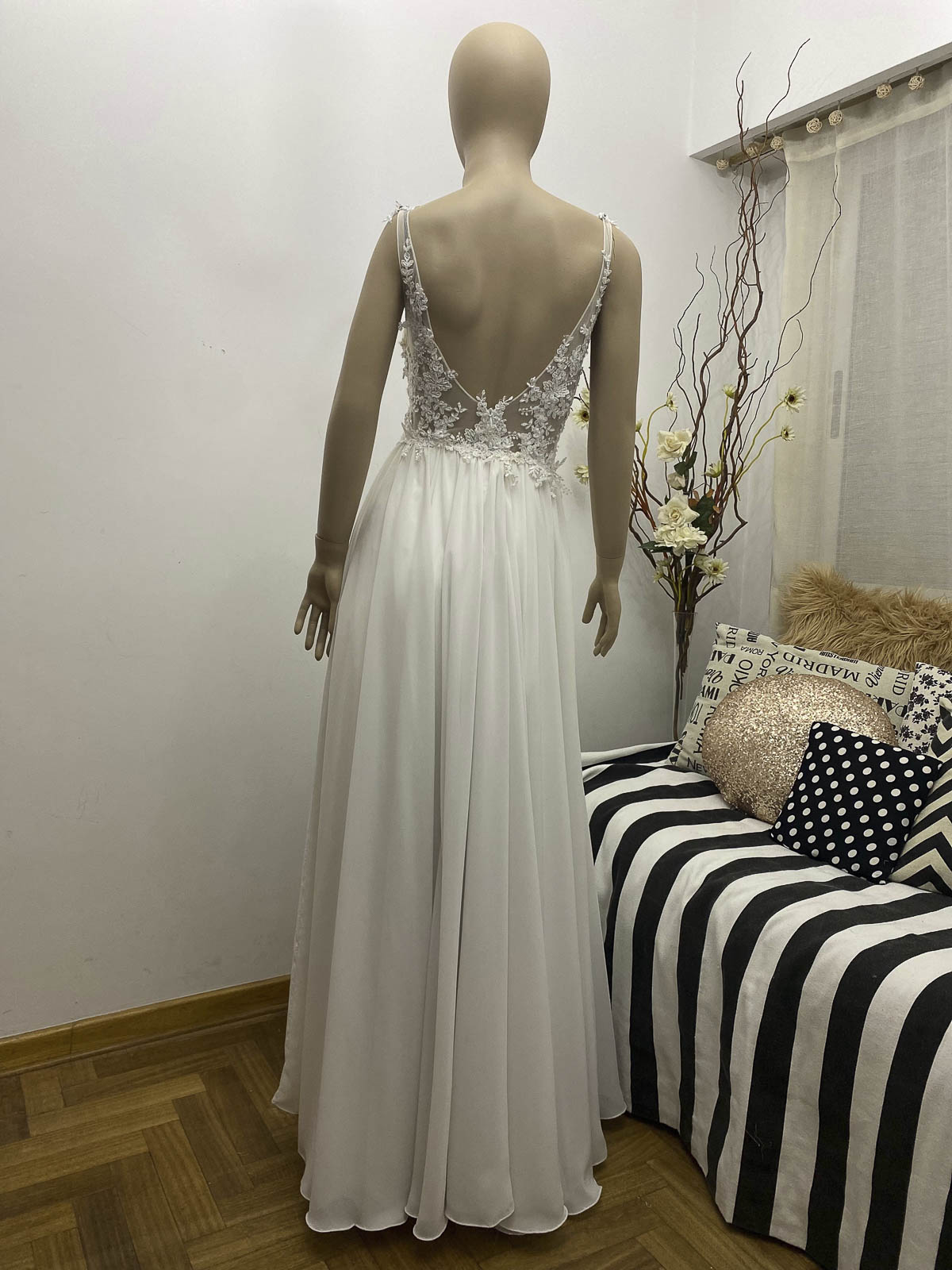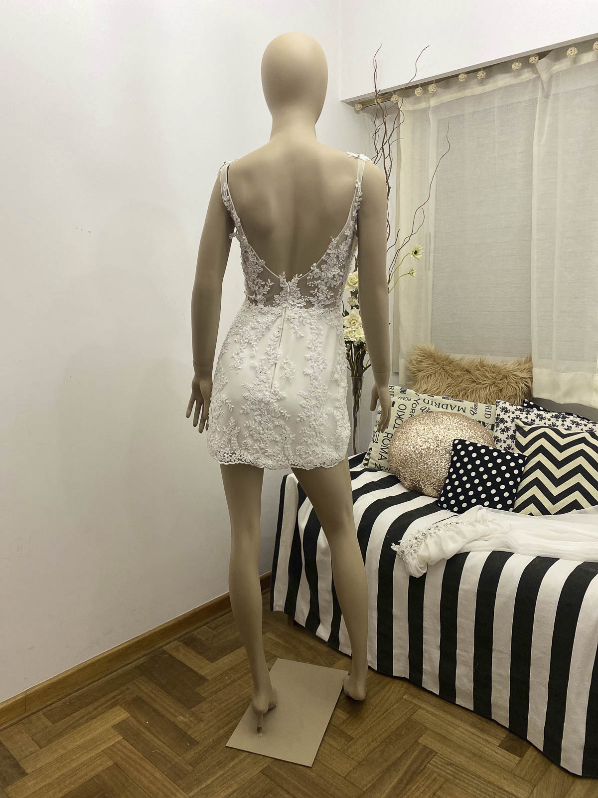 Conjunto en dos piezas de vestido corto al cuerpo de tul bordado con piedras. Escote en “V” delantero y espalda con transparencias en el corsage. Detalle de charreteras bordadas a mano con piedras en tono plata y strass. Falda plato de muselina de seda con detalle de bouquets de flores en 3D aplicadas a mano en la cintura – la falda larga se puede desmontar para que luego quede vestido corto –