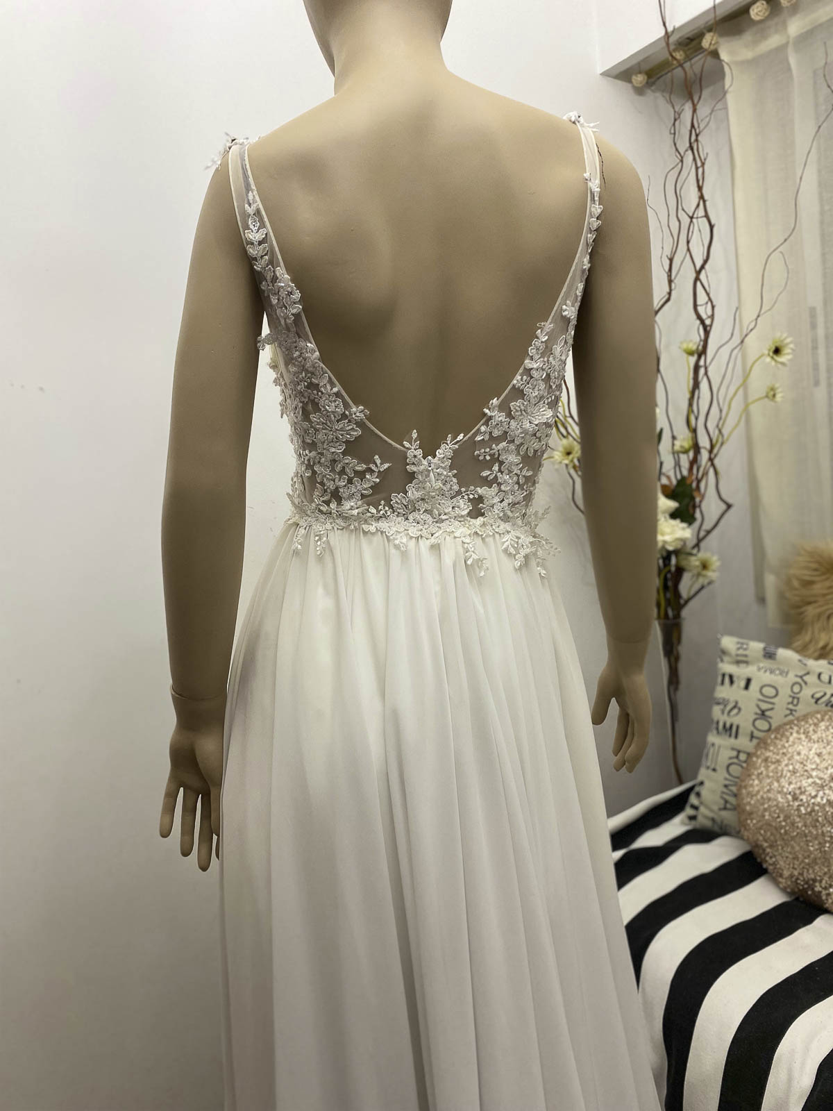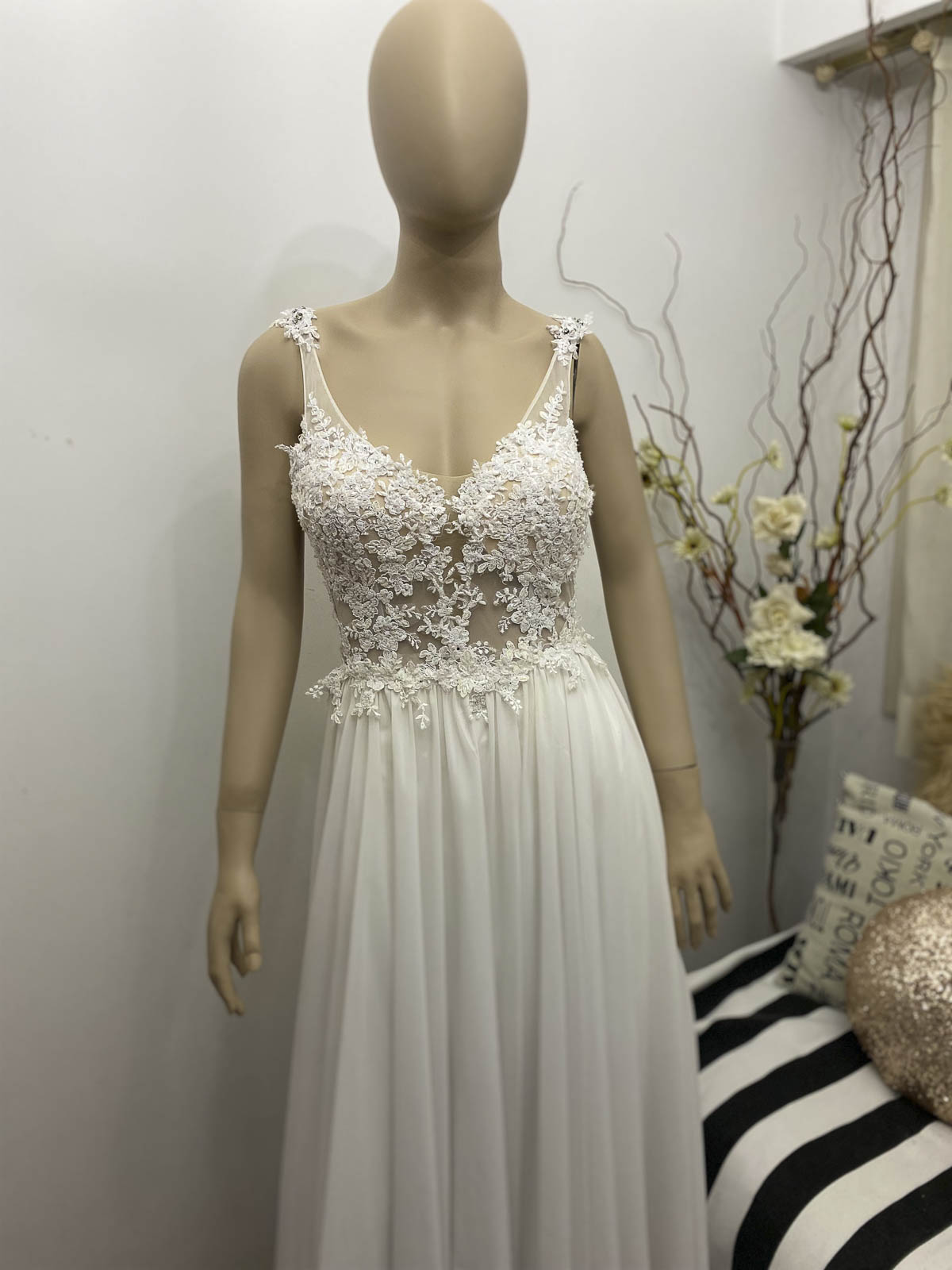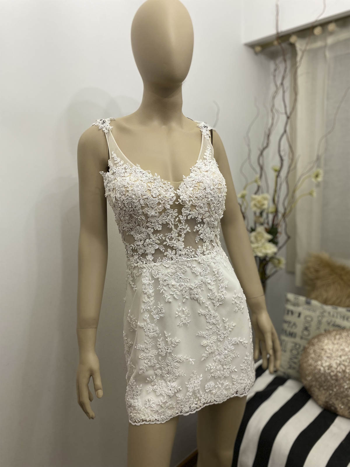 Conjunto en dos piezas de vestido corto al cuerpo de tul bordado con piedras. Escote en “V” delantero y espalda con transparencias en el corsage. Detalle de charreteras bordadas a mano con piedras en tono plata y strass. Falda plato de muselina de seda con detalle de bouquets de flores en 3D aplicadas a mano en la cintura – la falda larga se puede desmontar para que luego quede vestido corto –