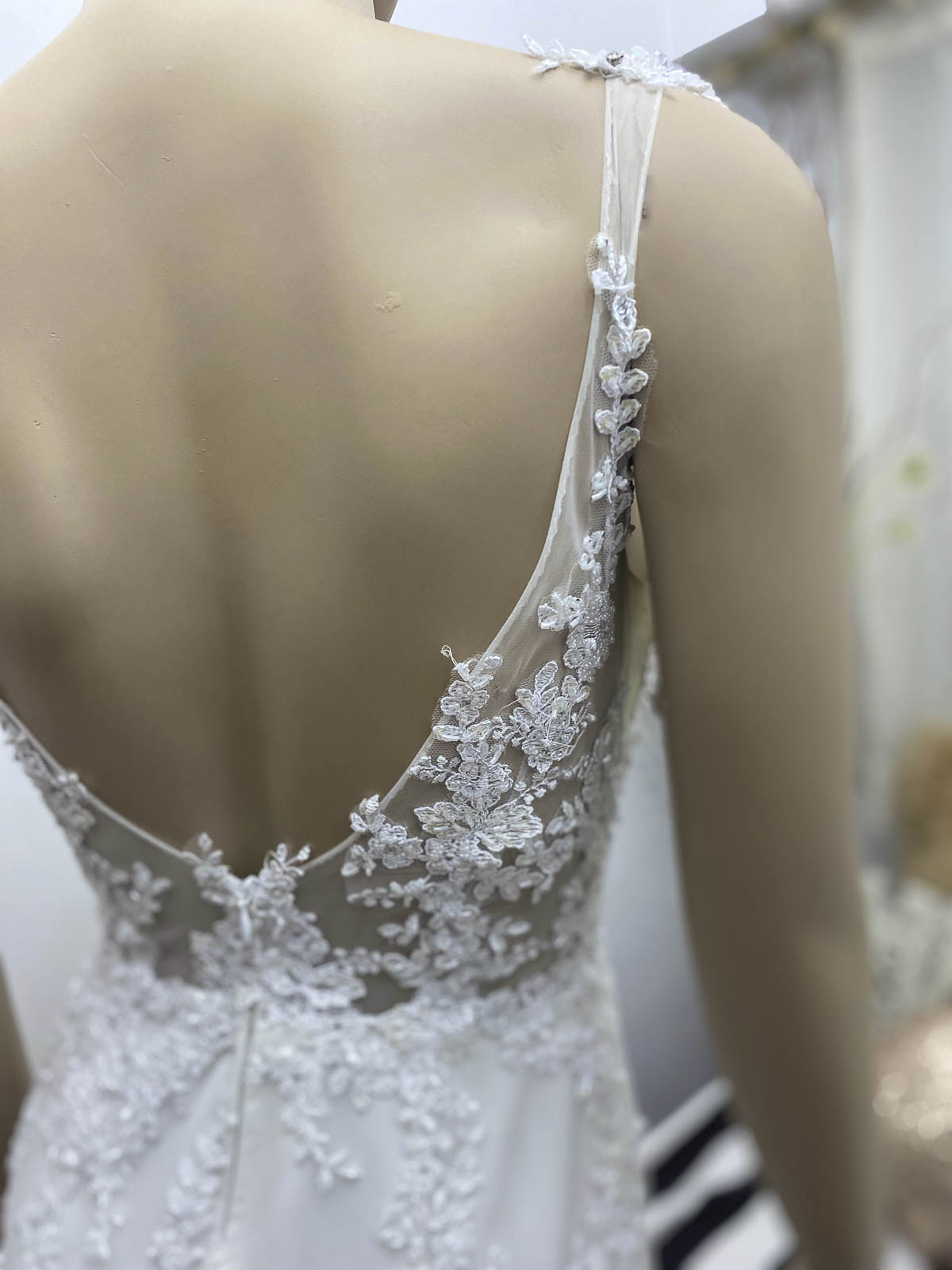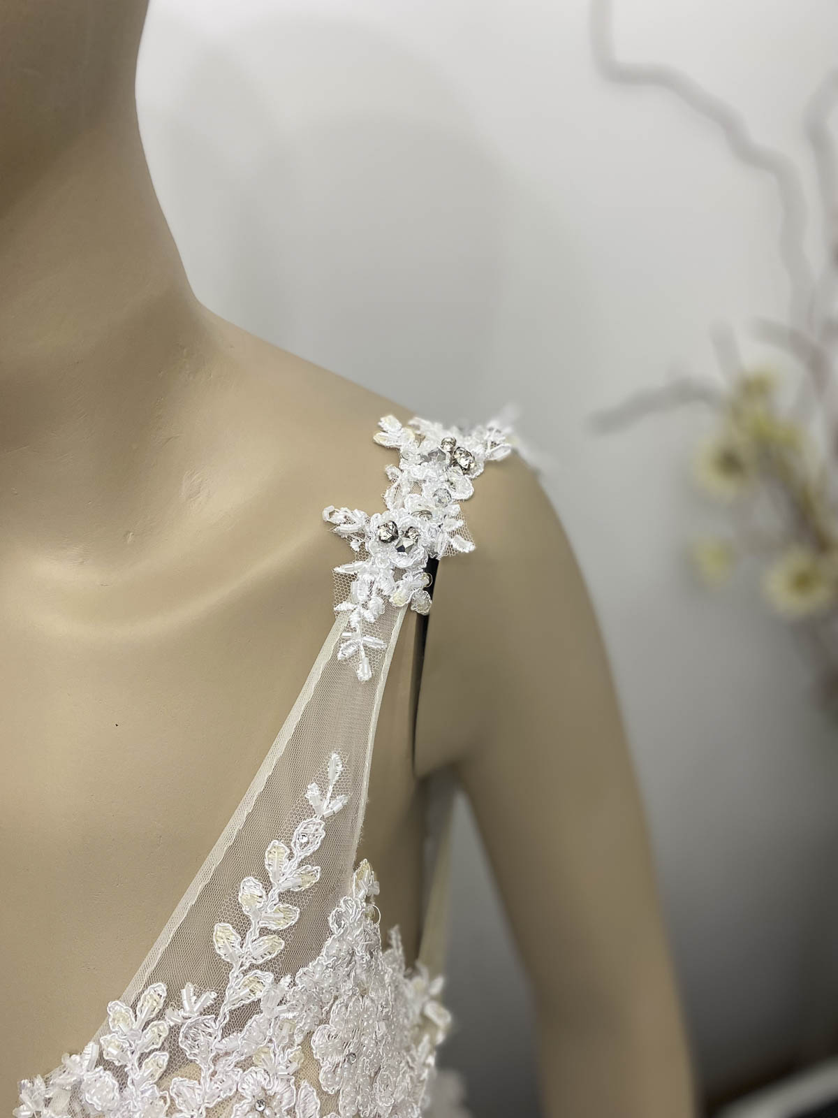 • Tiene el detalle de las charreteras del vestido y la cintura de la falda totalmente aplicado a mano en relieve.