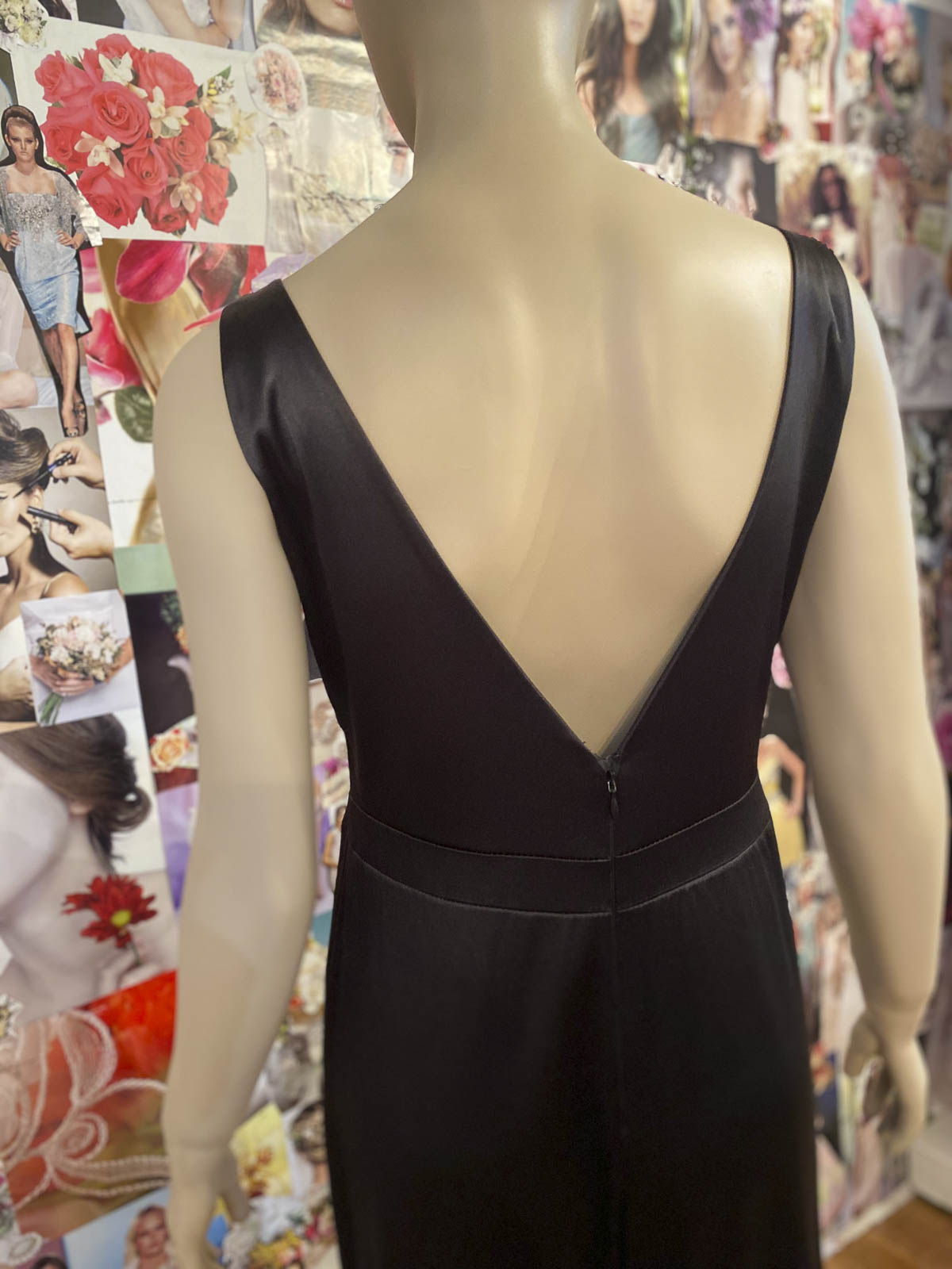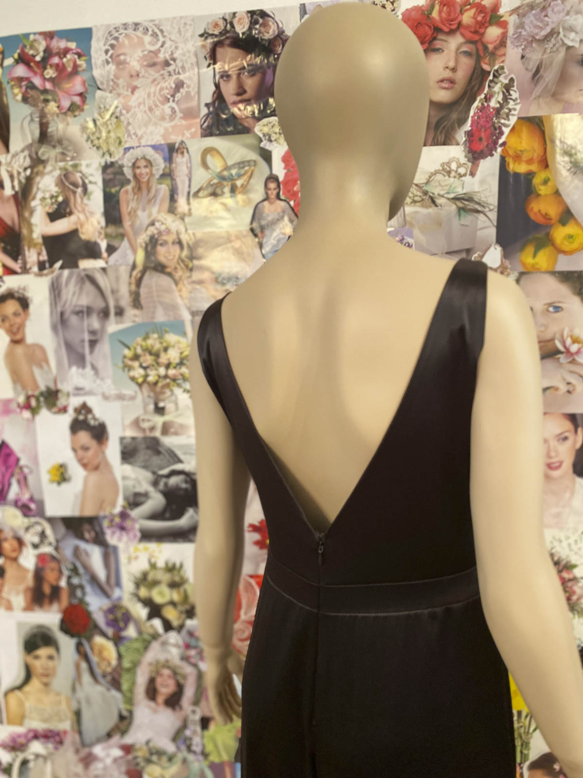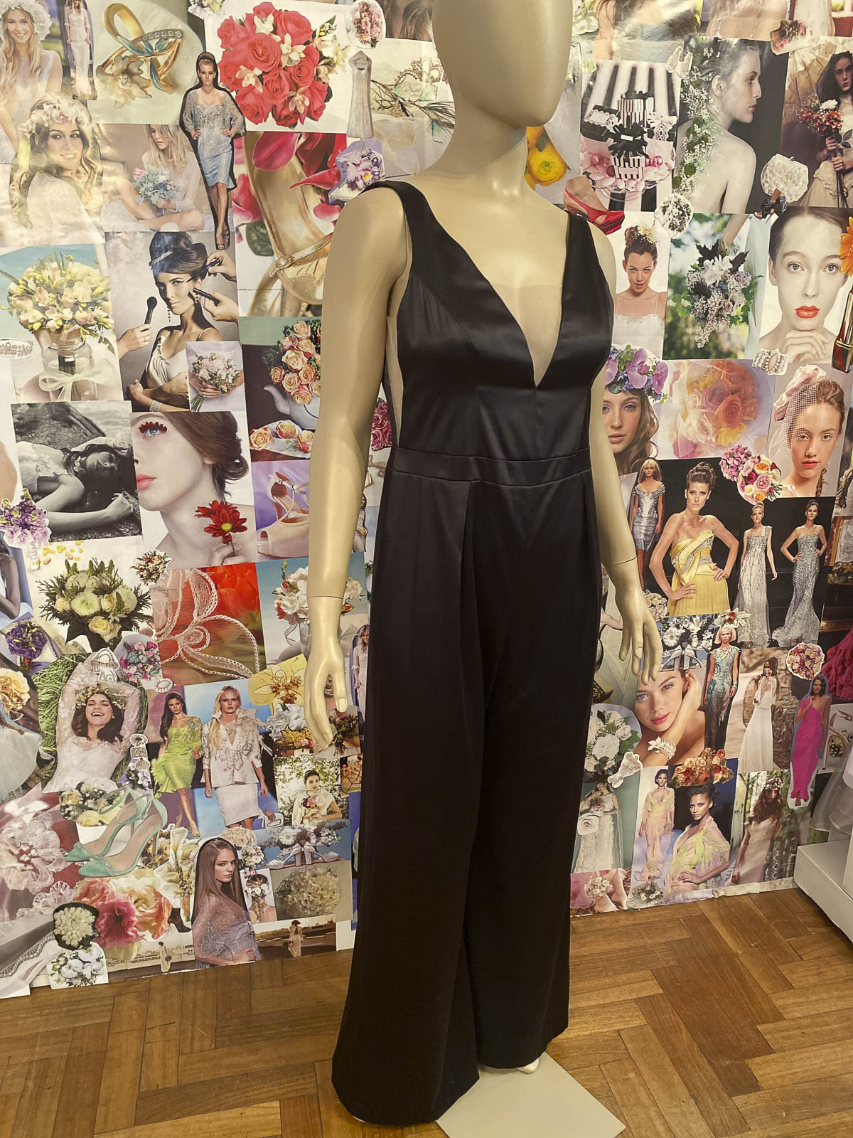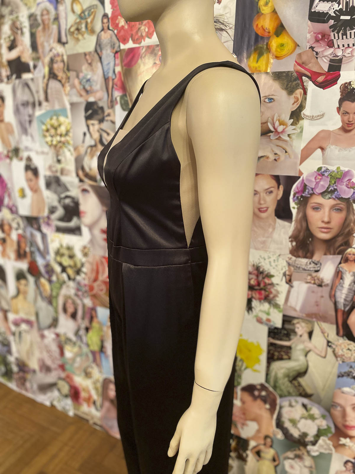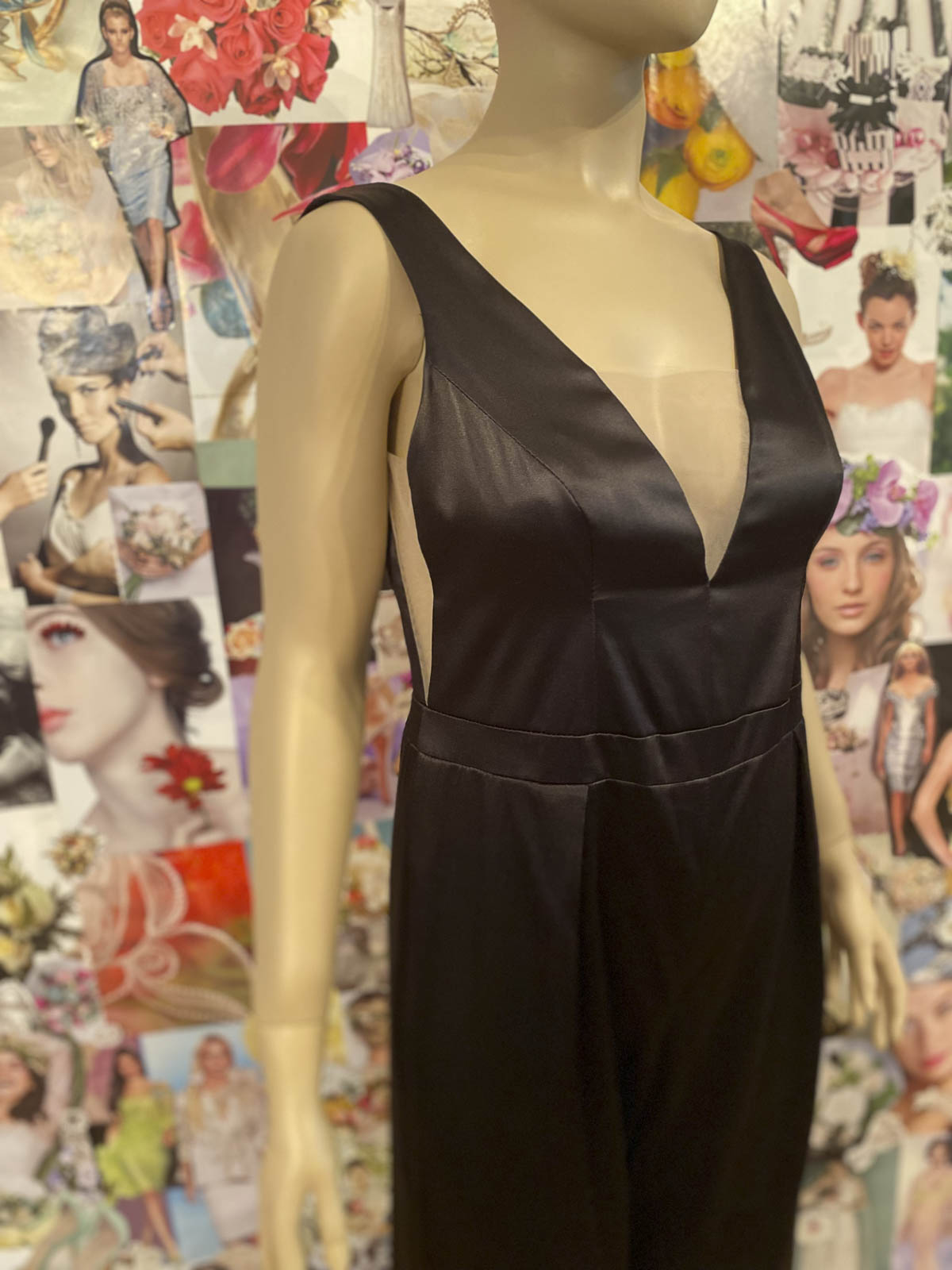 Mono de raso en color negro con transparencias con tul piel en el escote delantero y costados. Pantalón con tablas.
