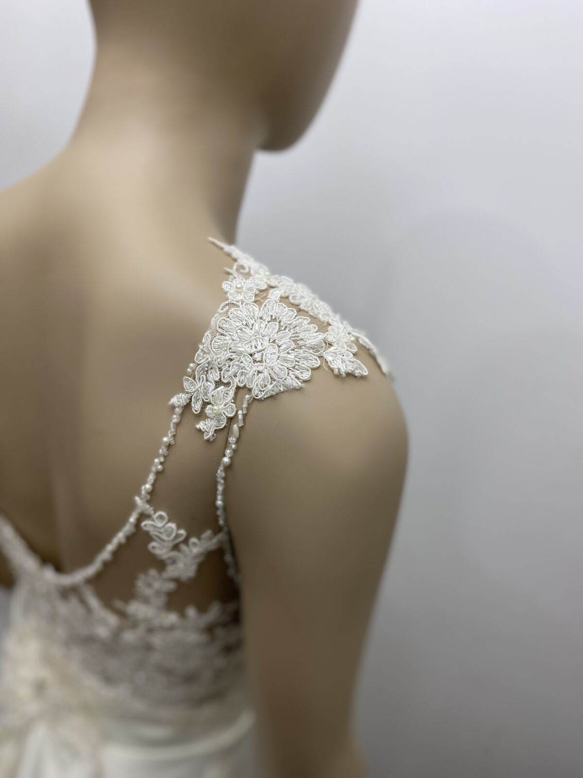 El encaje tiene un delicado brillo de paillettes, canutillos y perlas al tono.