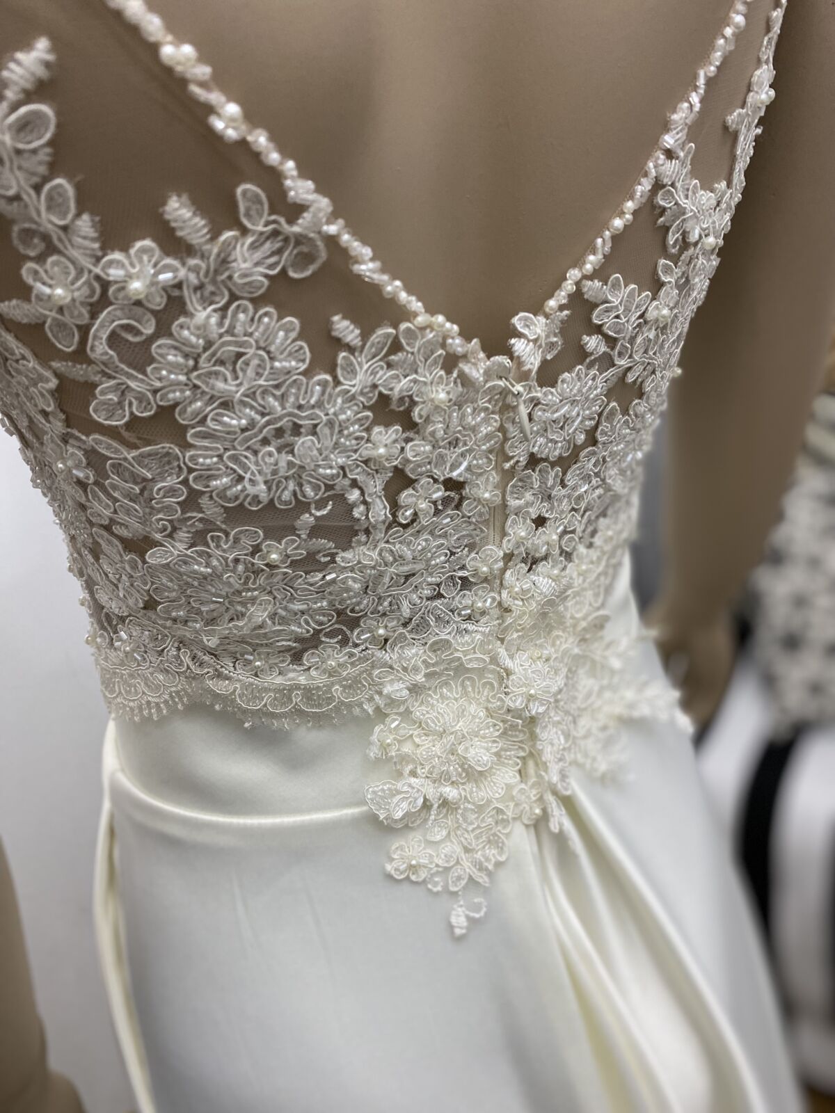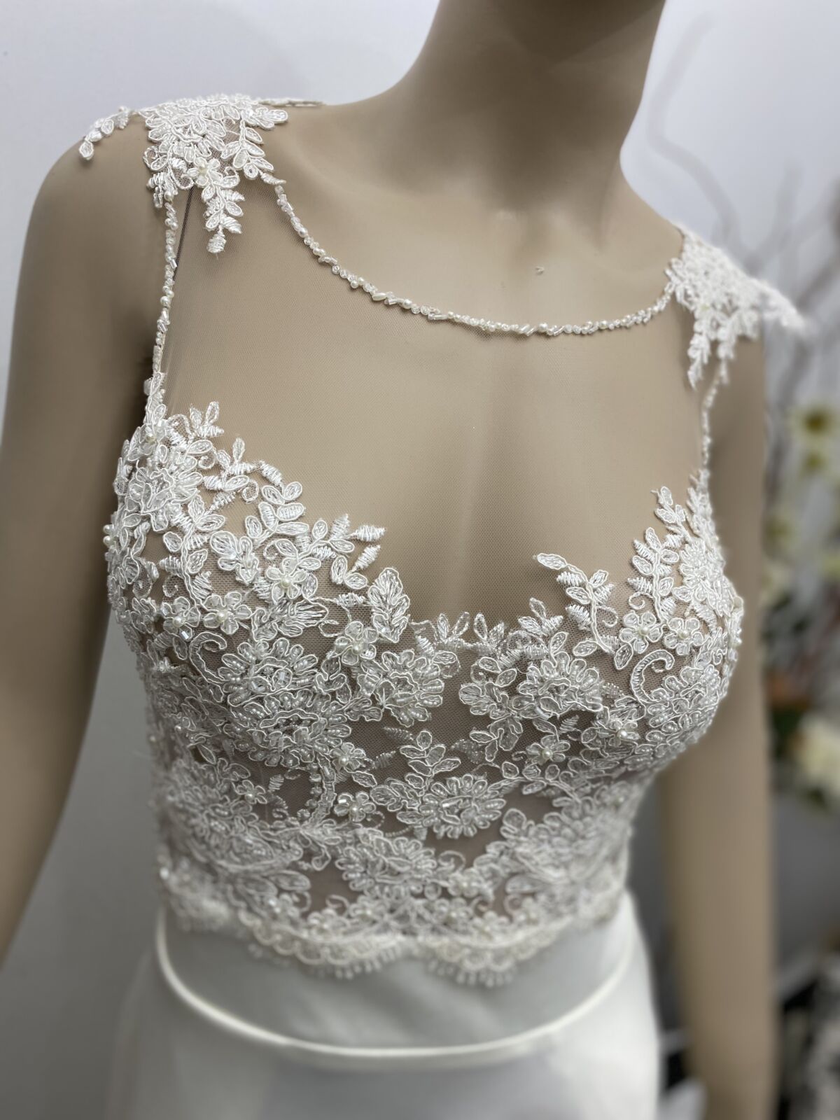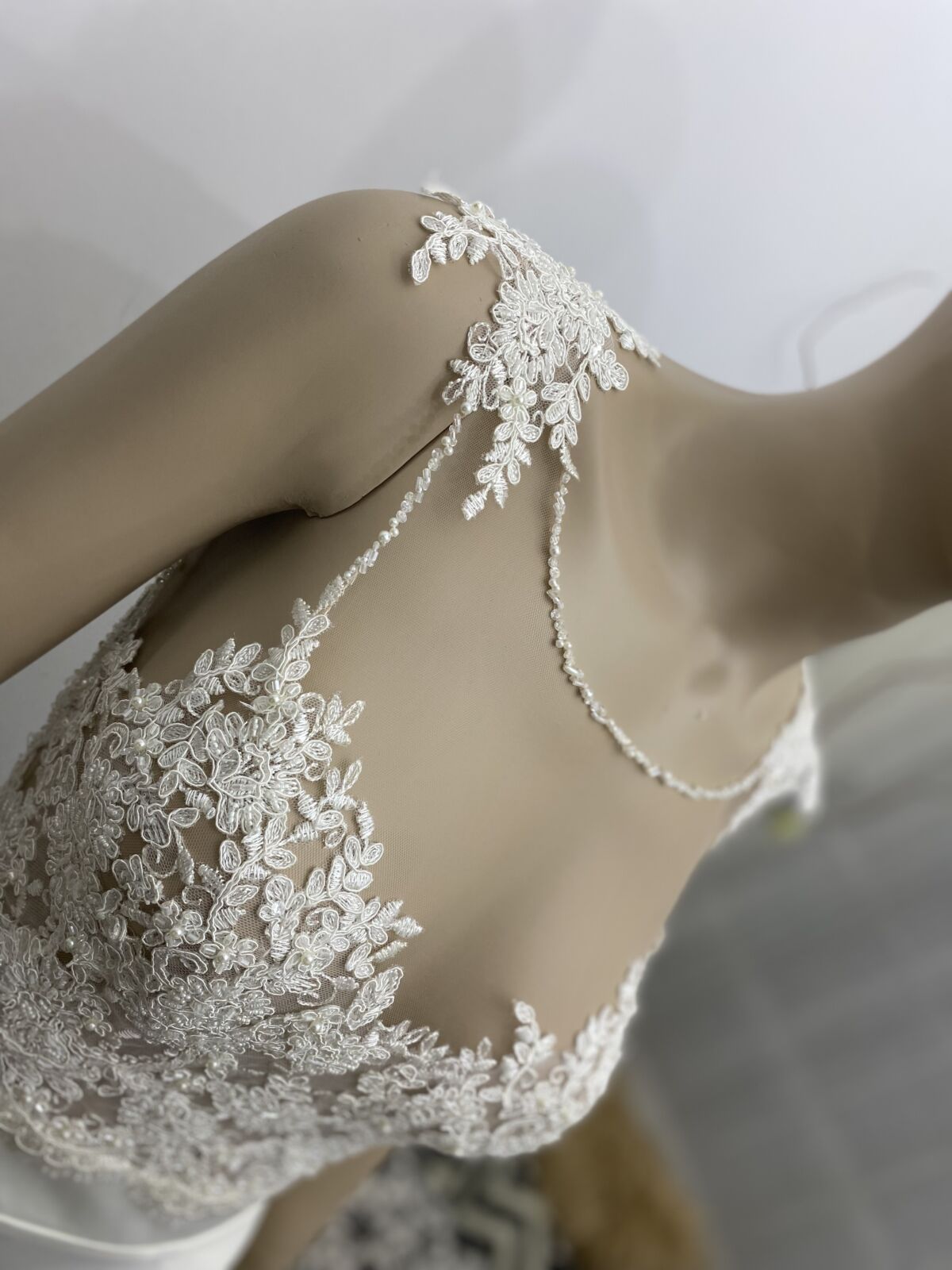 La base del corsage está trabajado con tul de seda color piel y el encaje está incrustado a mano.