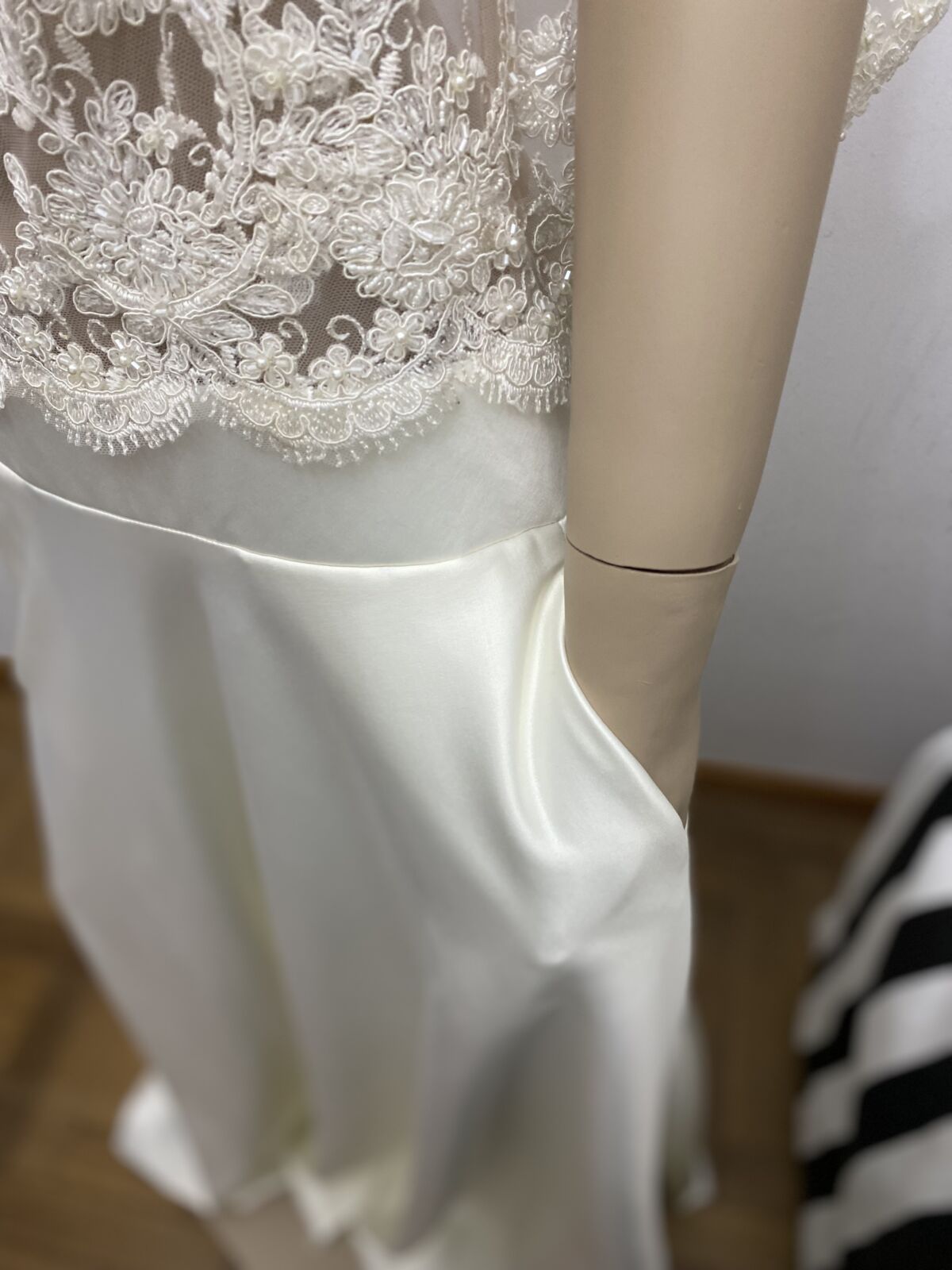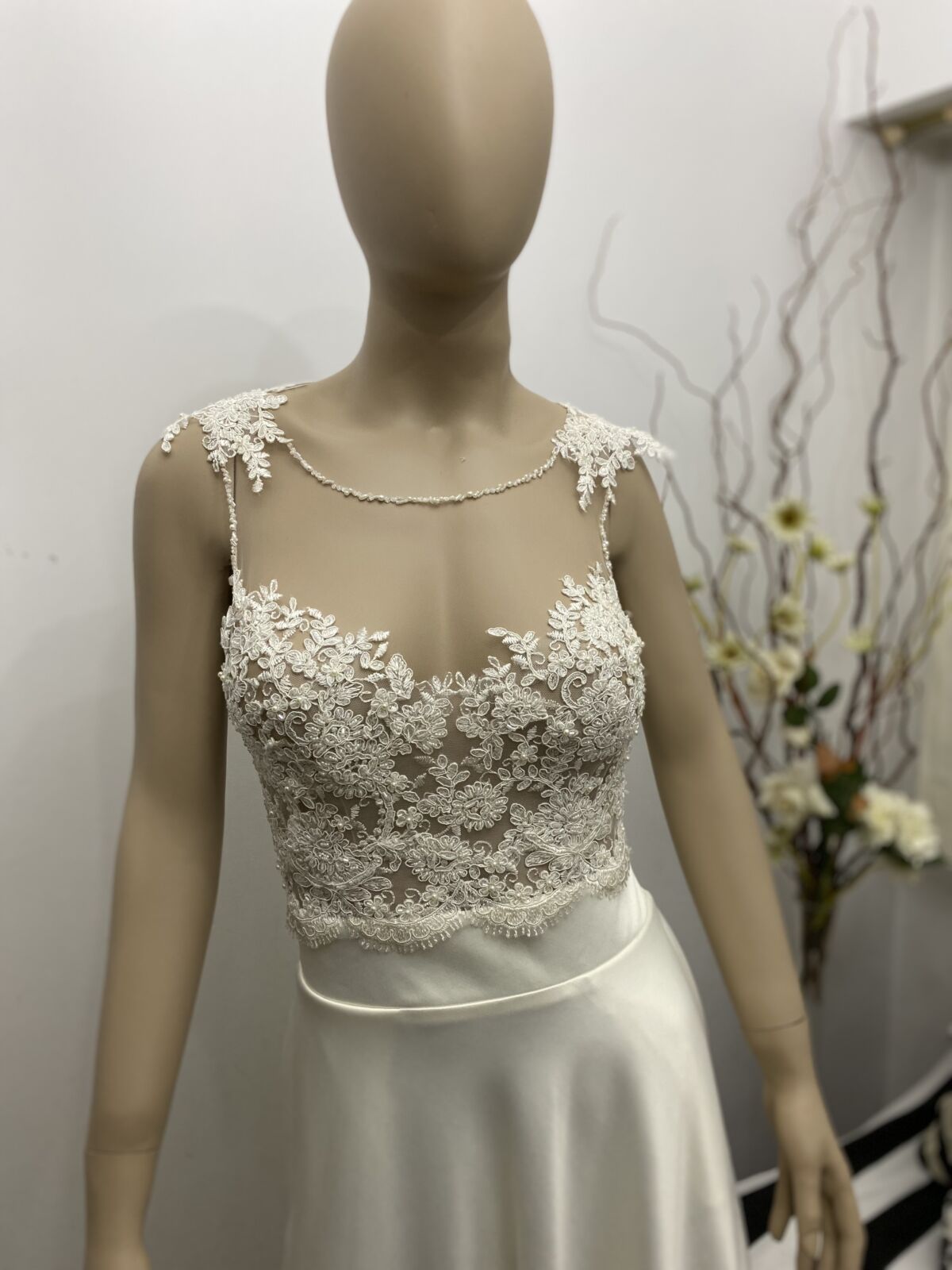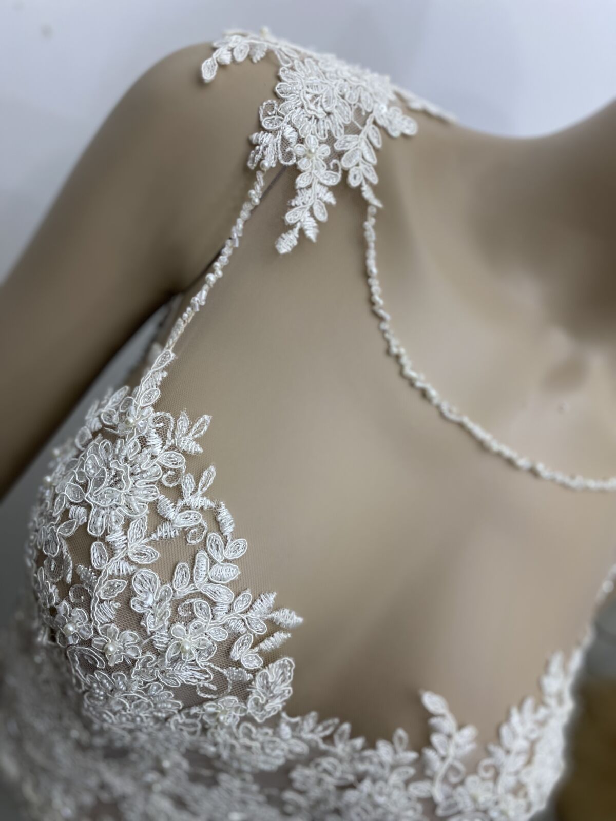 La base del corsage está trabajado con tul de seda color piel y el encaje está incrustado a mano.