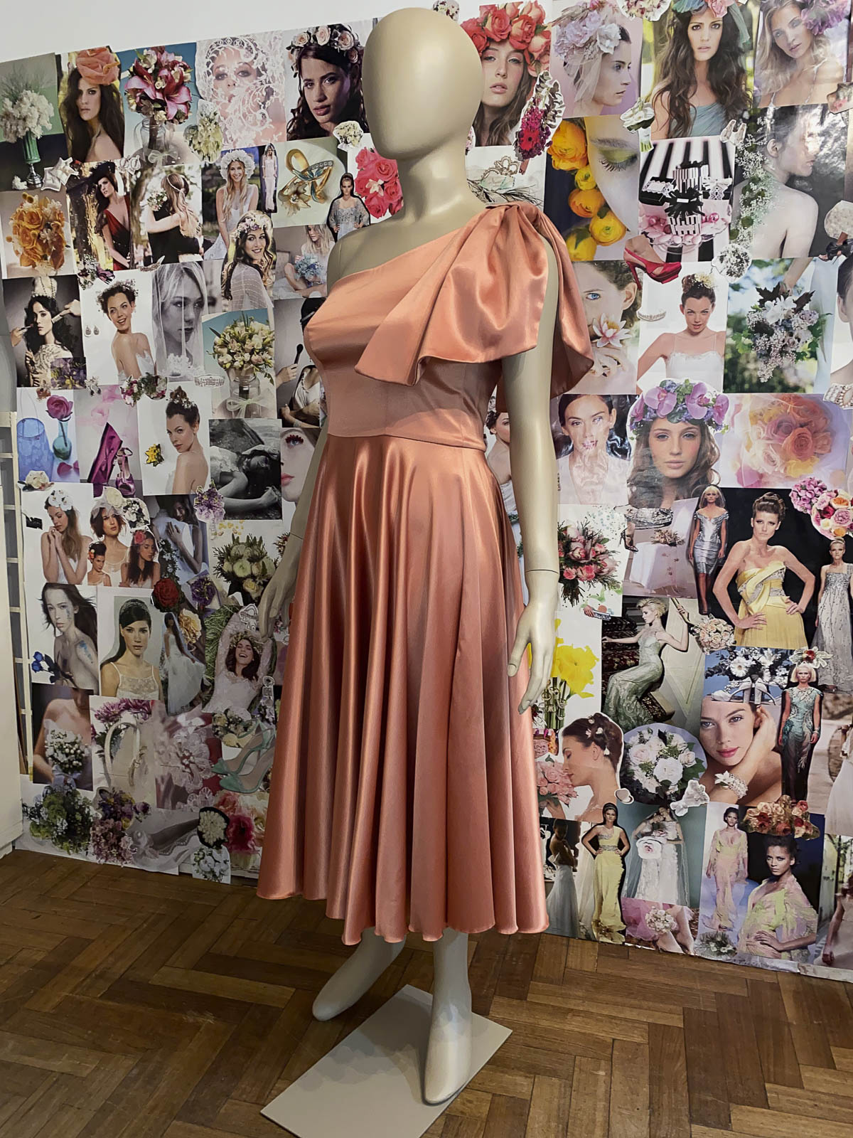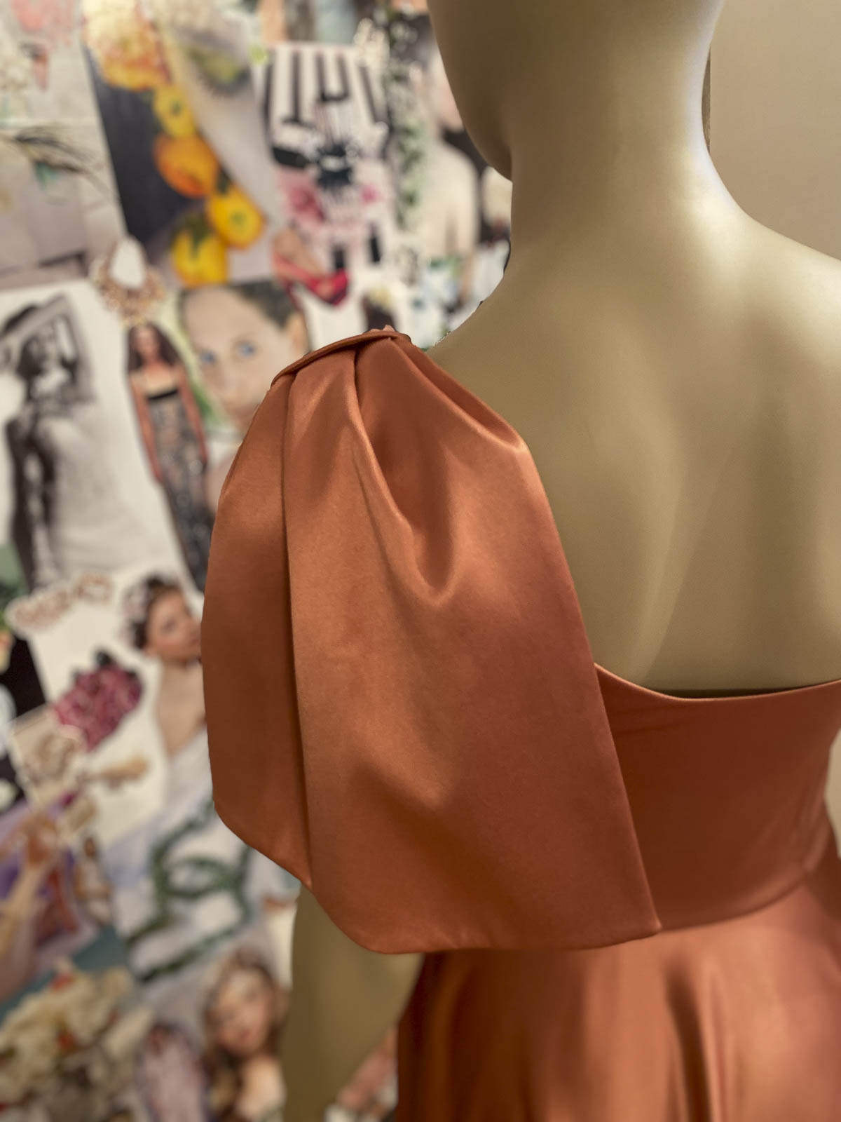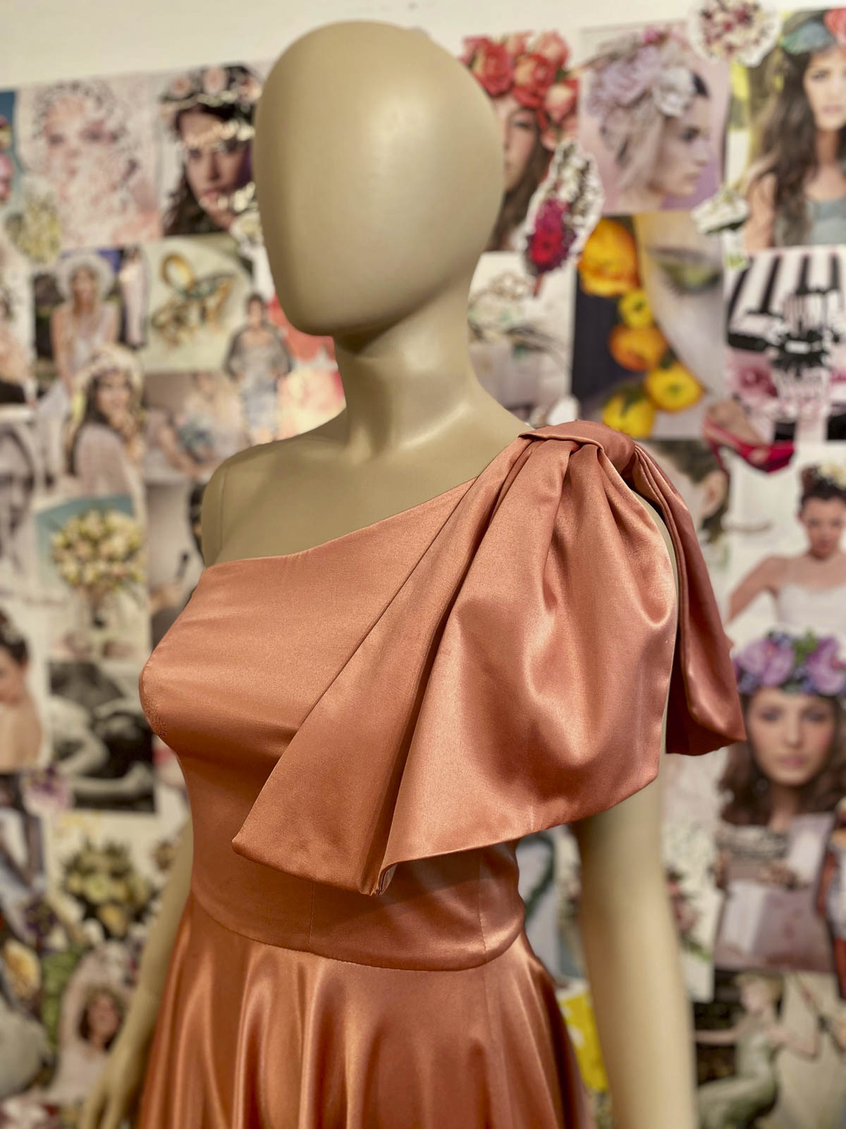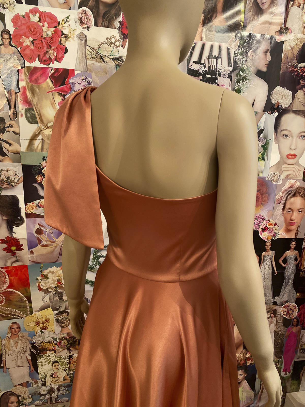 Vestido color bronce claro de un solo hombro con falda midi corte plato.