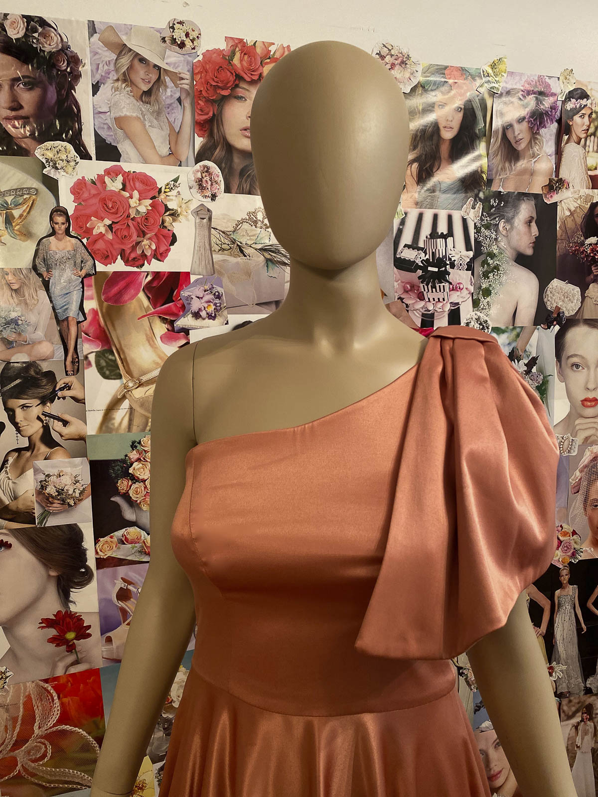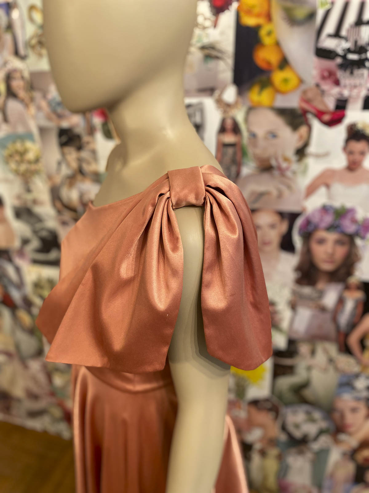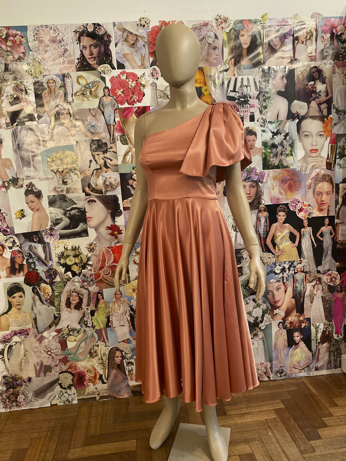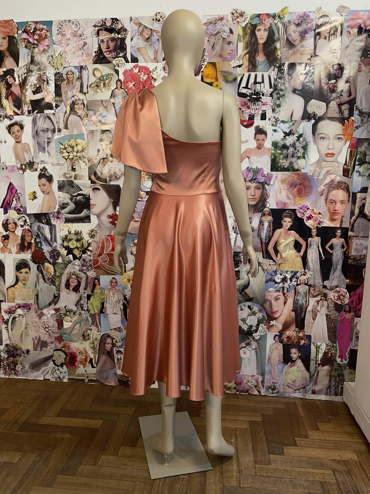 Vestido color bronce claro de un solo hombro con falda midi corte plato.