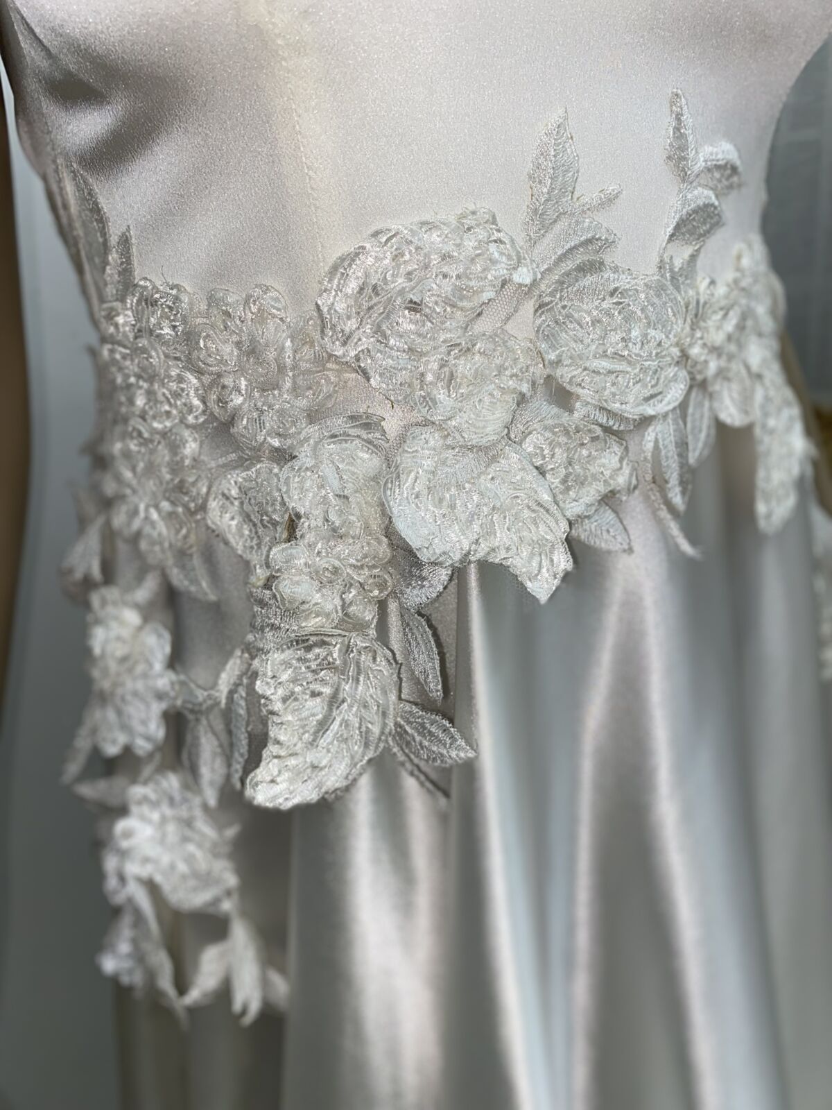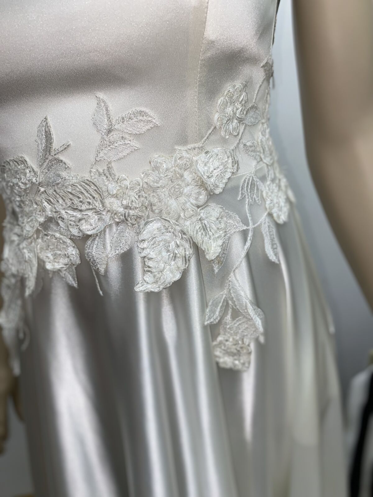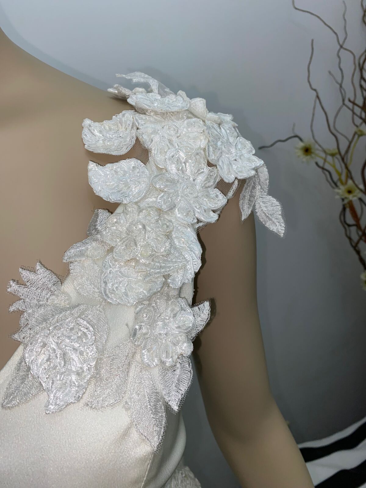 El bouquet de flores 3D realza el hombro y remarca la cintura. Las flores tienen un sutil detalle de brillo.