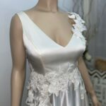 Vestido entero de raso con spandex, con falda plato al bies con brillo satinado. Corsage con escote en “V” delantero y espalda profunda. Flores 3D como único detalle de realce en la cintura y en un solo hombro.