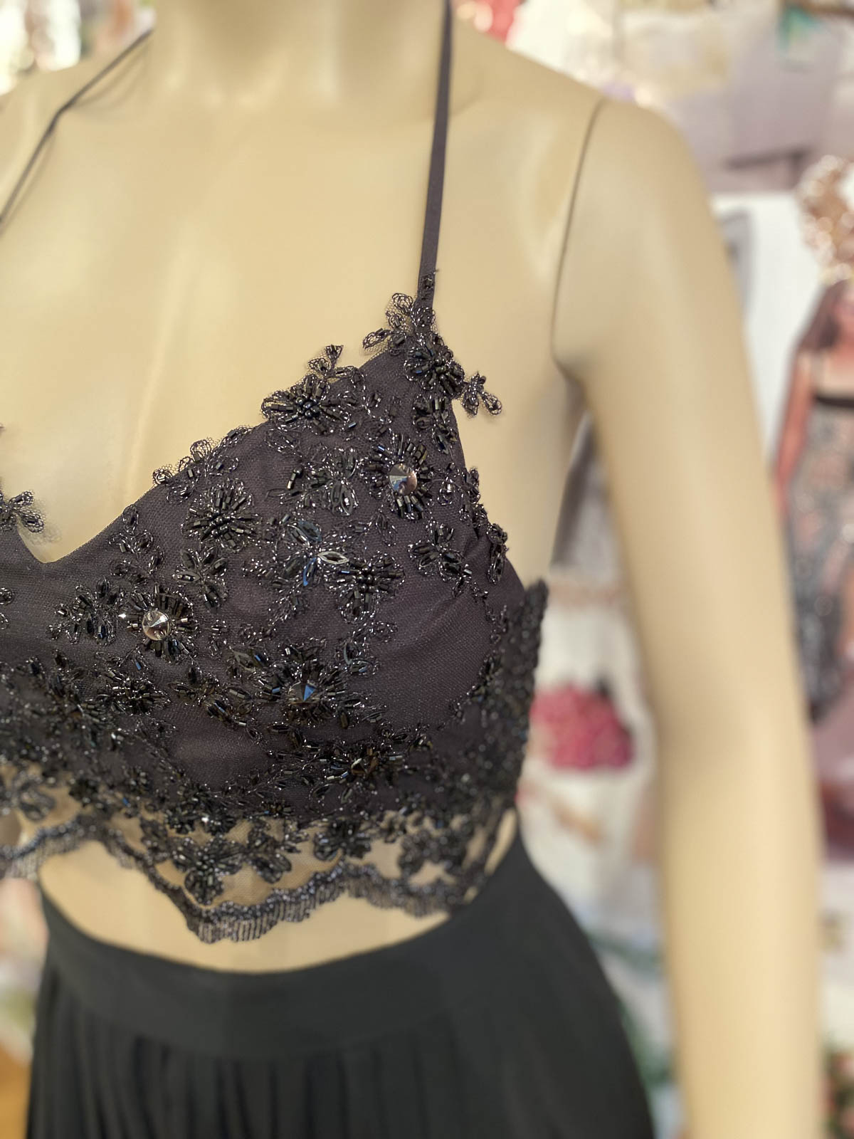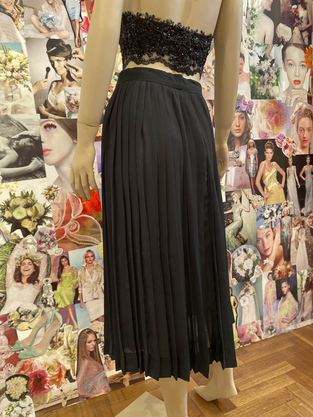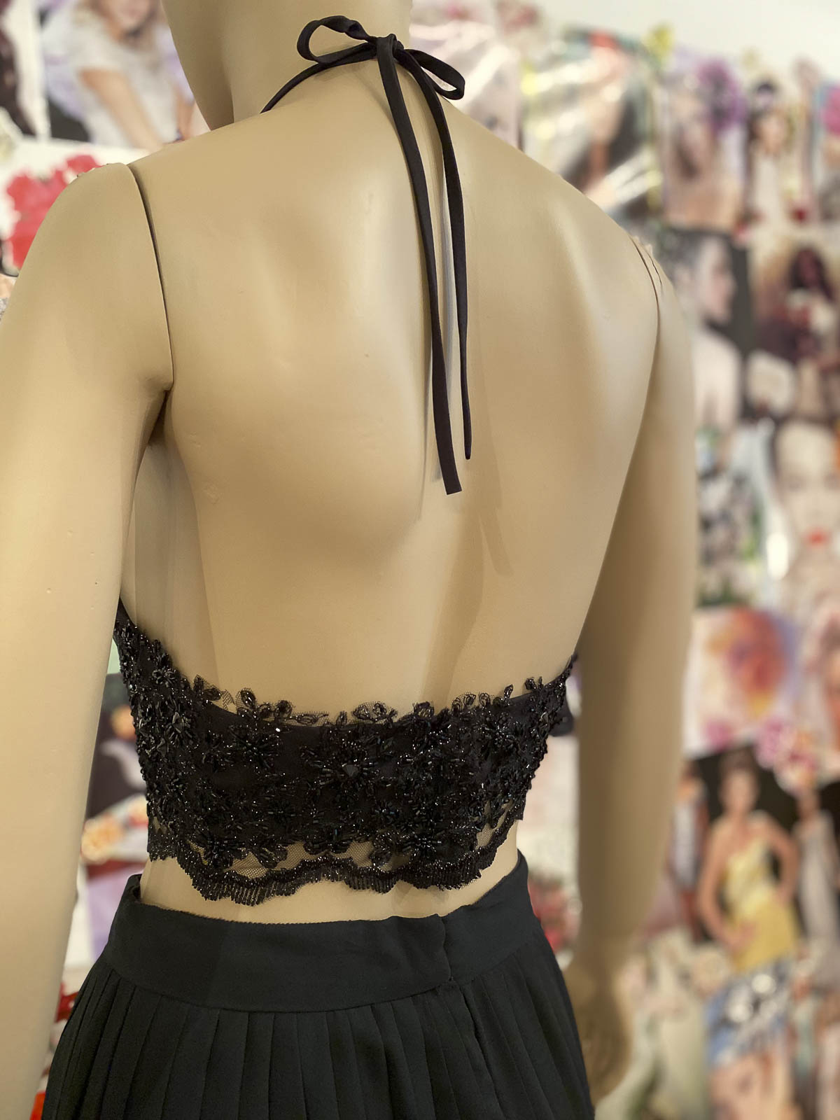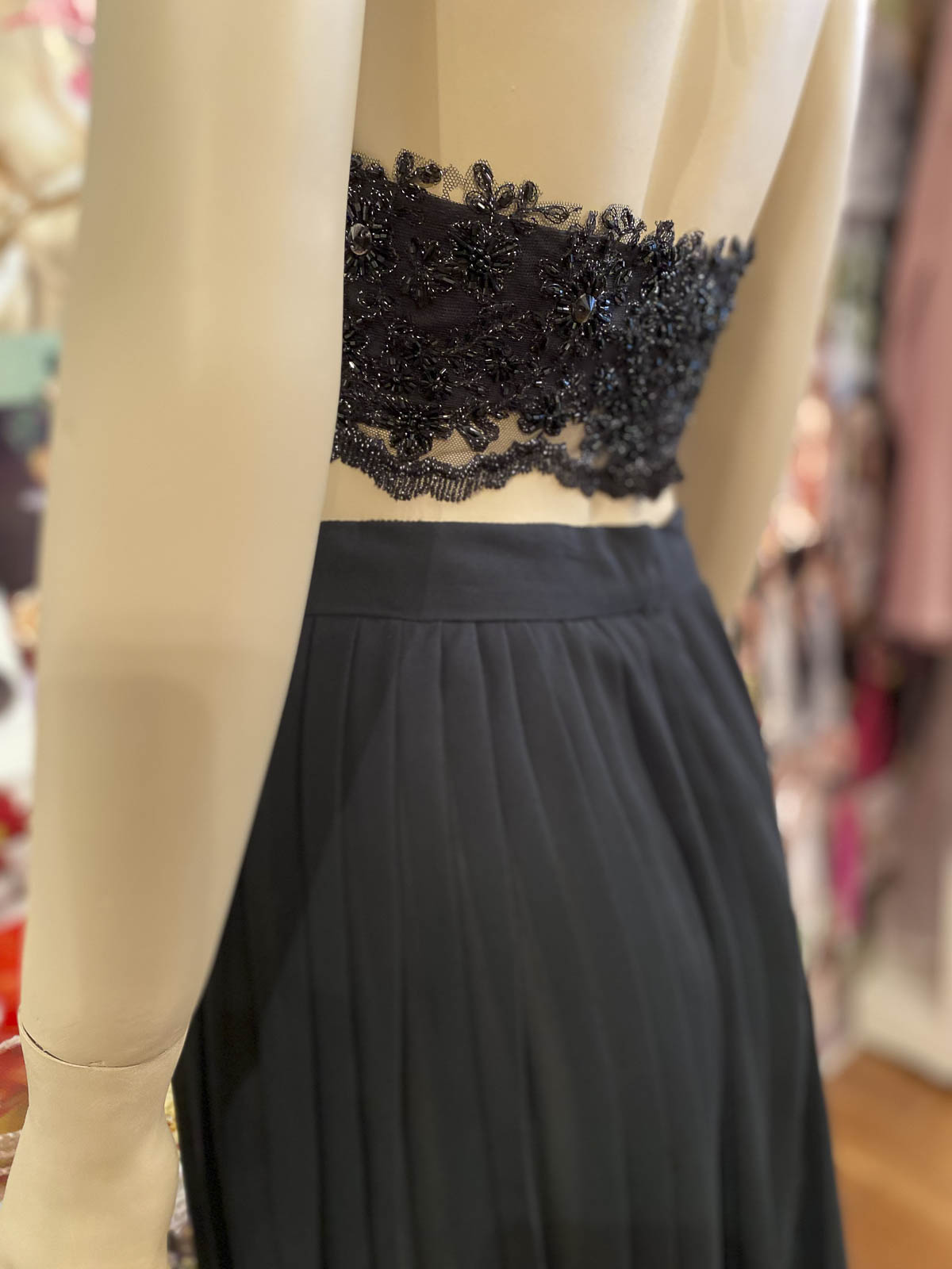 Dos piezas con top de tul bordado con piedras, escote “V” y espalda descubierta. Falda plisada de largo midi.