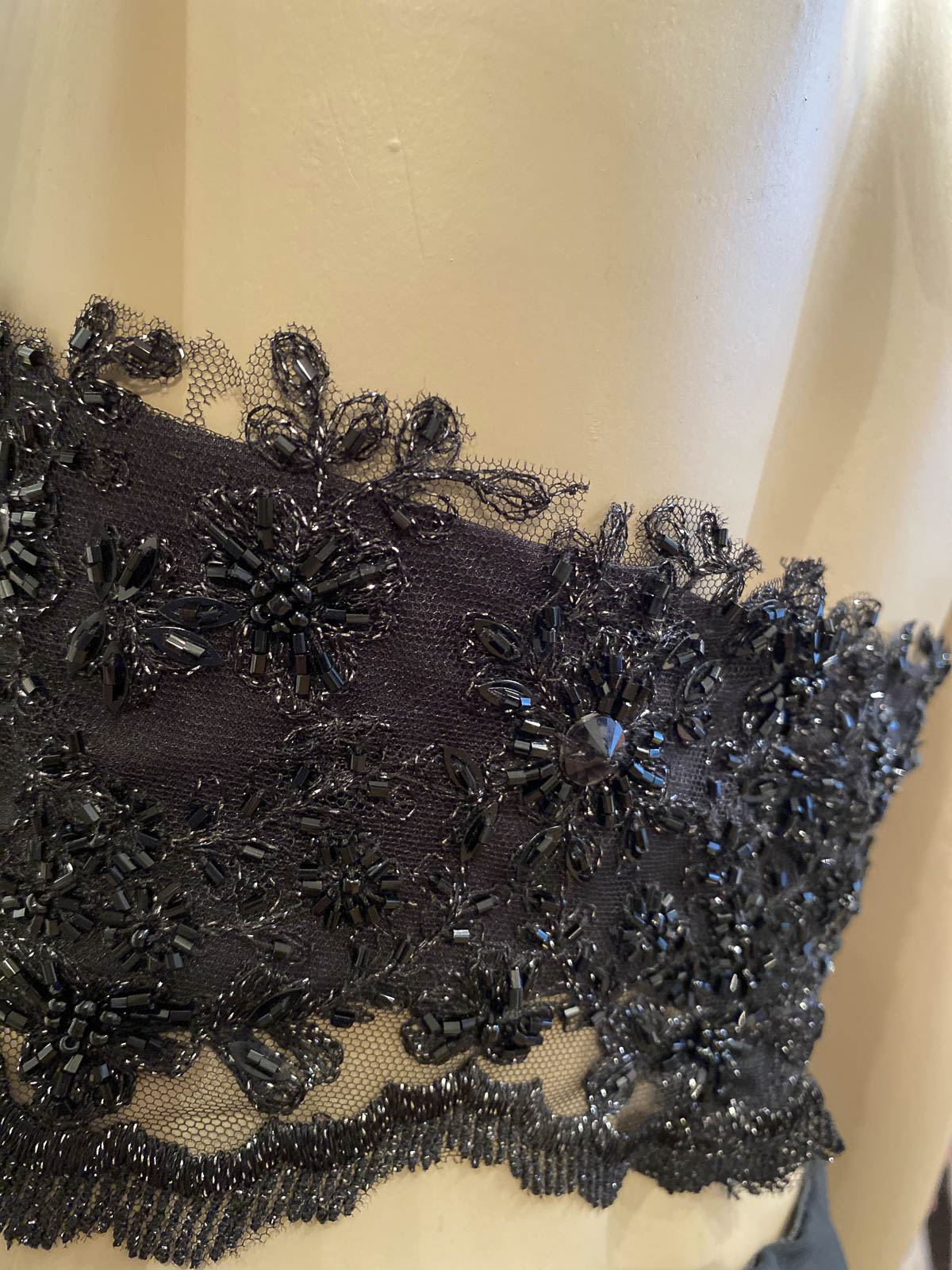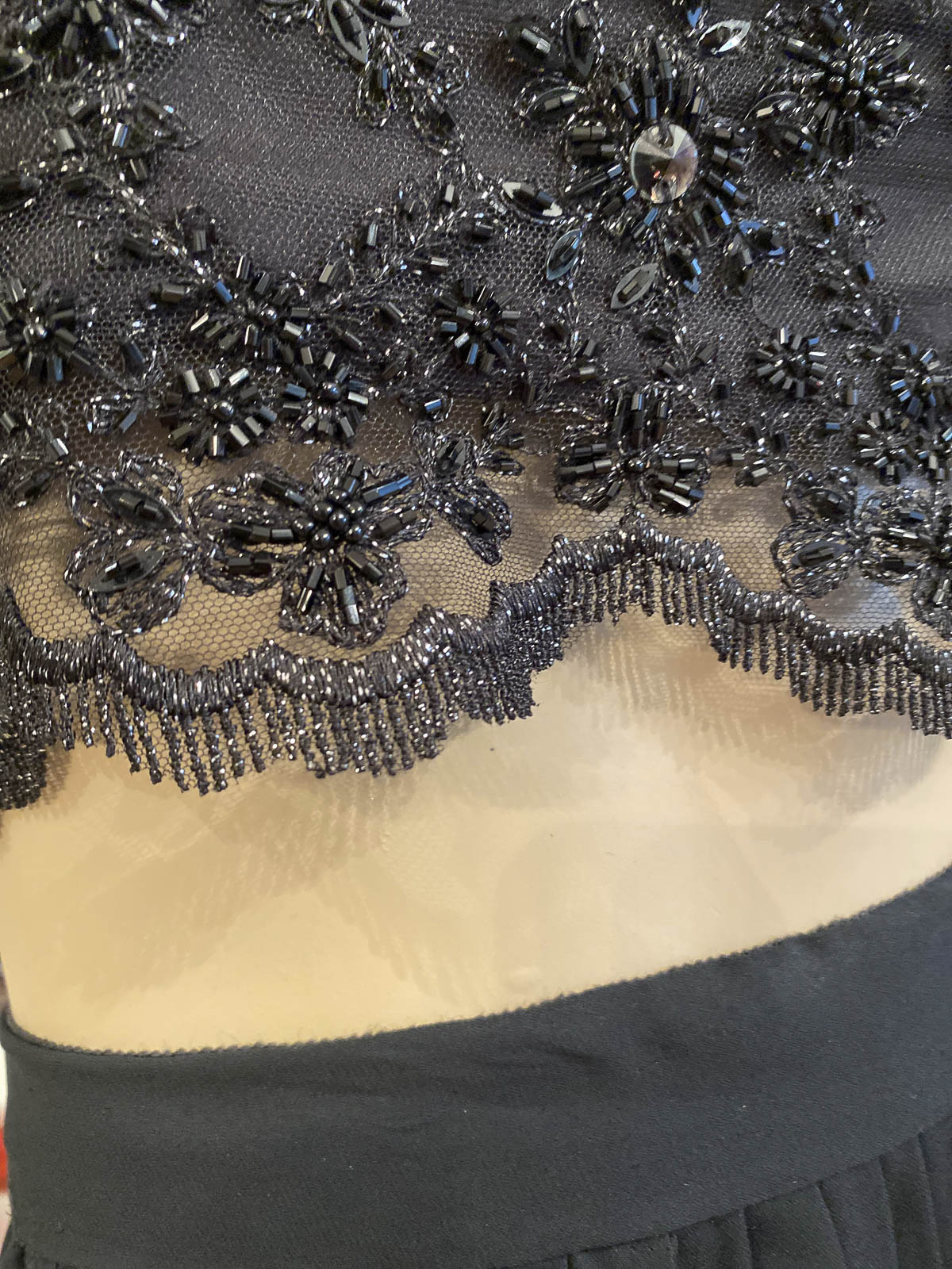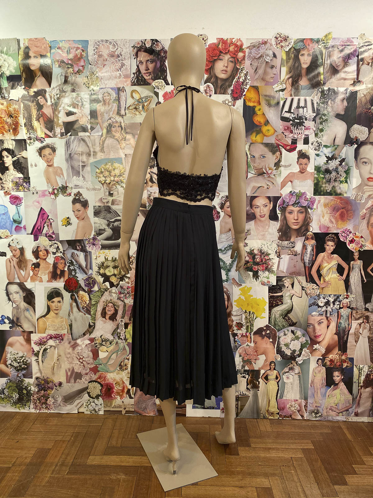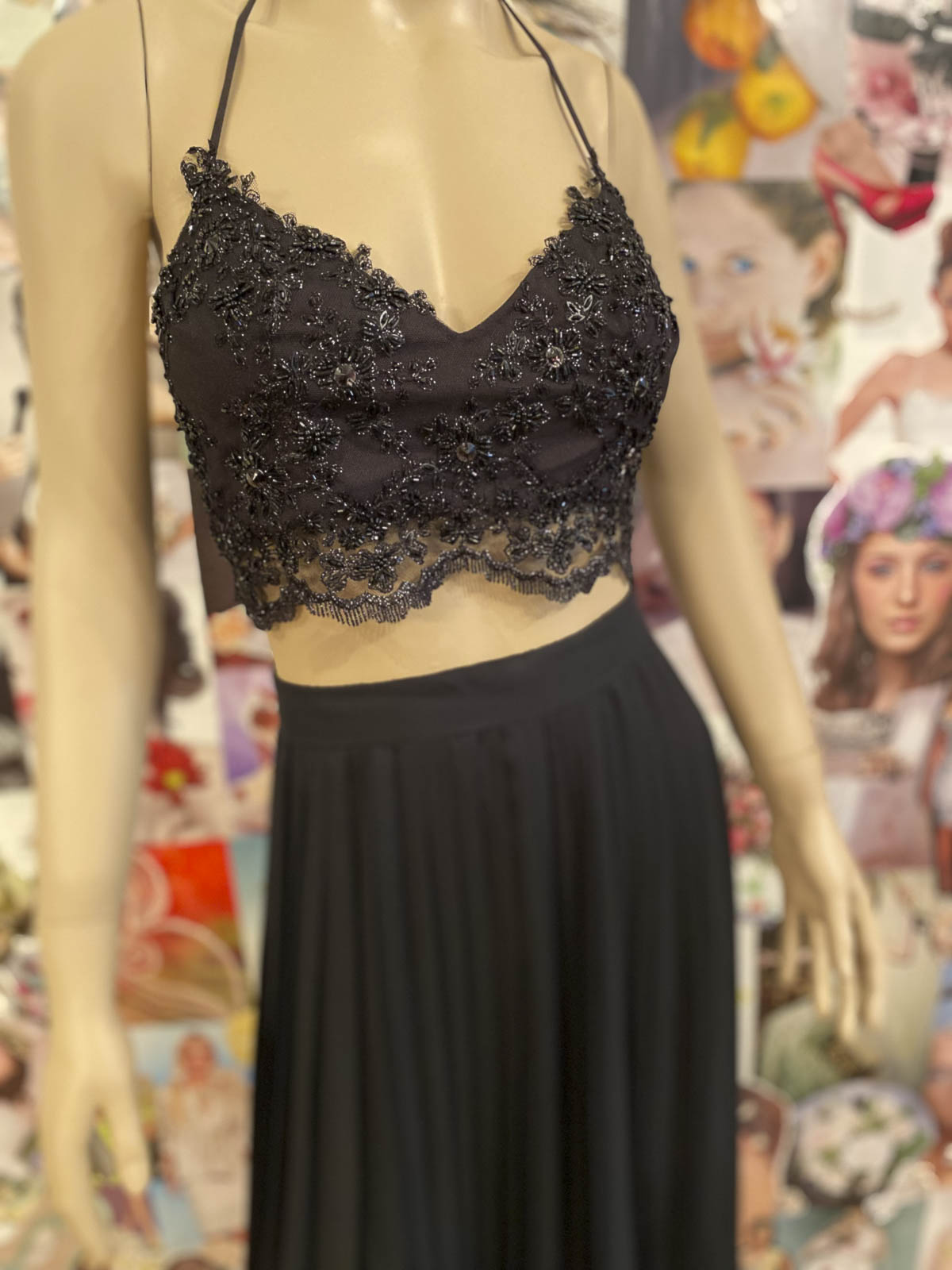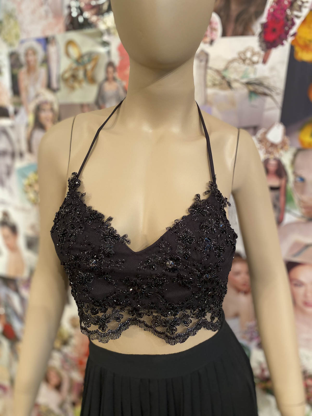 Dos piezas con top de tul bordado con piedras, escote “V” y espalda descubierta. Falda plisada de largo midi.
