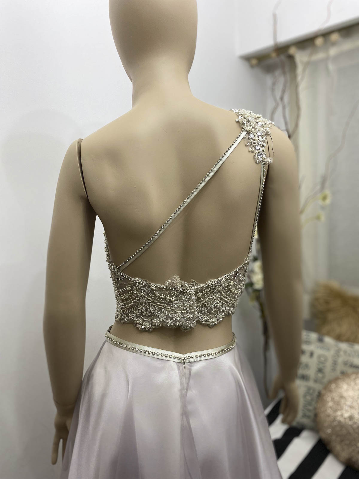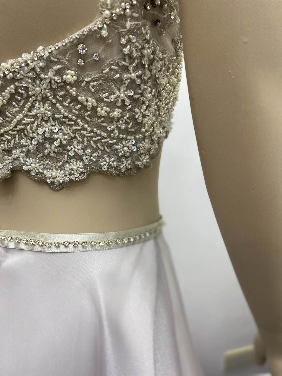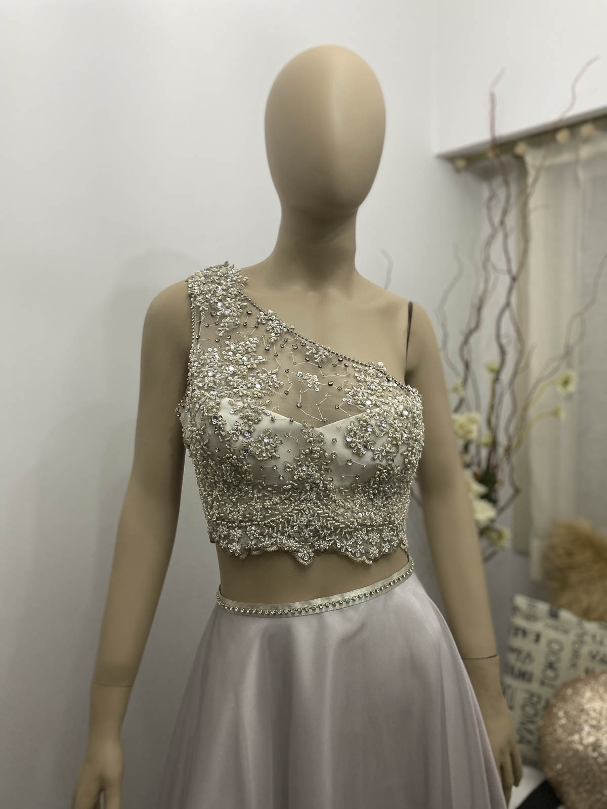 Conjunto en dos piezas de crop top con base de raso italiano en tono champagne y superposición plata de tul bordado y organza. Top de un solo hombro con bouquetbordado en relieve. Falda plato con detalle de strass bordado a mano en la cintura.