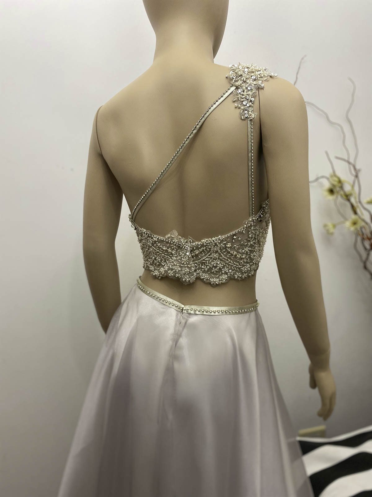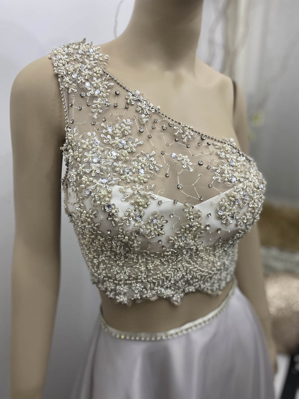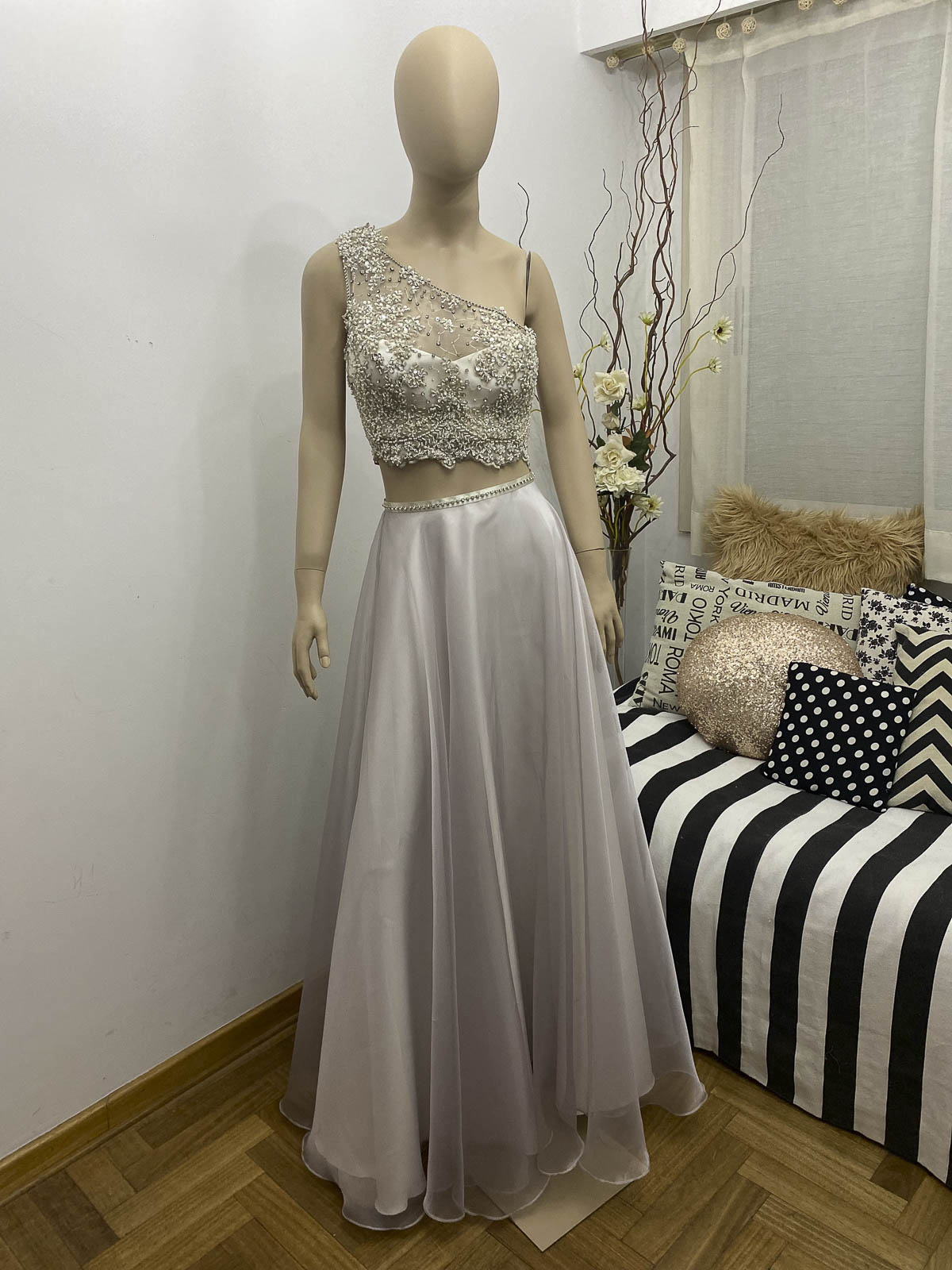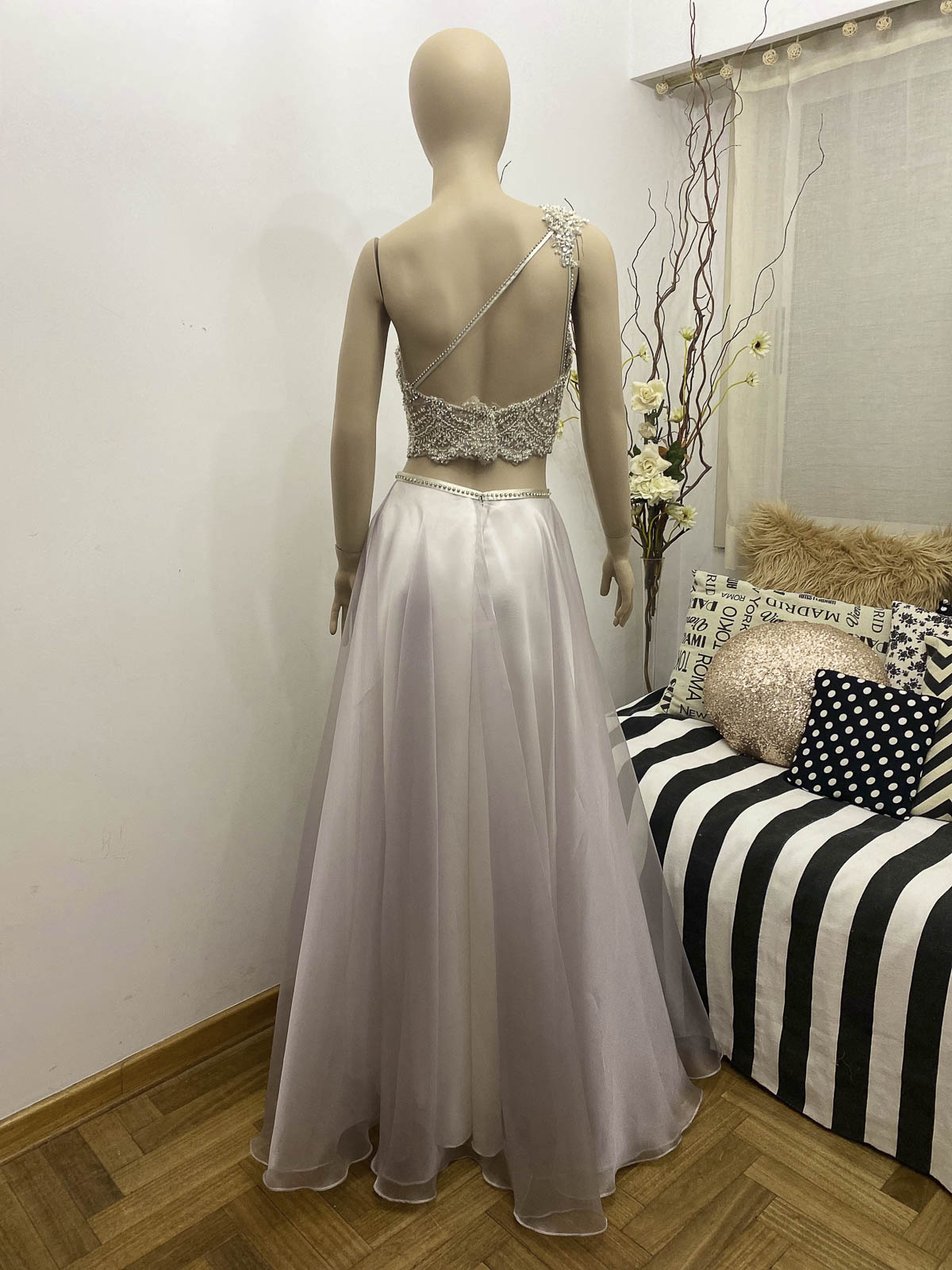 Conjunto en dos piezas de crop top con base de raso italiano en tono champagne y superposición plata de tul bordado y organza. Top de un solo hombro con bouquetbordado en relieve. Falda plato con detalle de strass bordado a mano en la cintura.